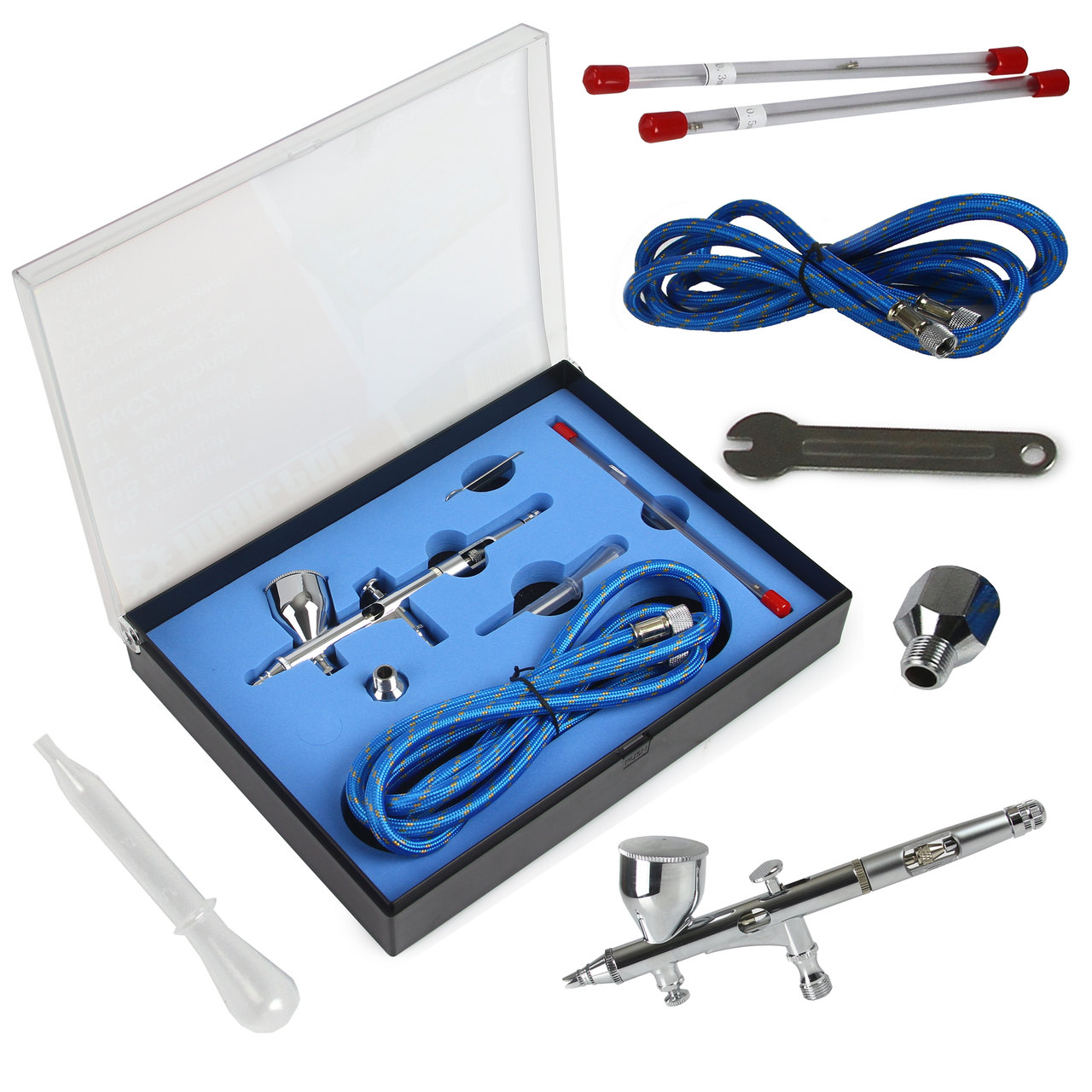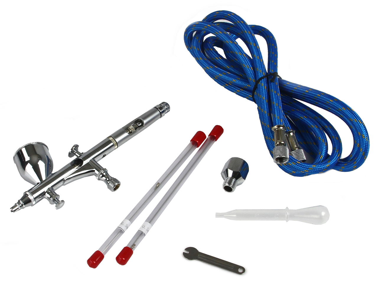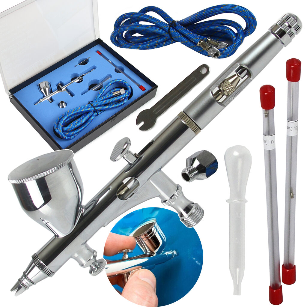 Stosowanie wymiennych końcówek (na końcówkę składa się: dysza, łuska oraz iglica) umożliwia dobór kształtu i szerokości strumienia oraz rozmycia lub wyostrzenia krawędzi malowanych detali – odpowiednio do wykonywanej pracy.