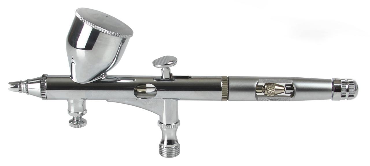 Jest to aerograf dwufunkcyjny co oznacza, że przyciskiem regulujemy zarówno ilość podawanego powietrza (ruchy w dół i w górę) jak również ilość farby (ruchy do tyłu i do przodu).