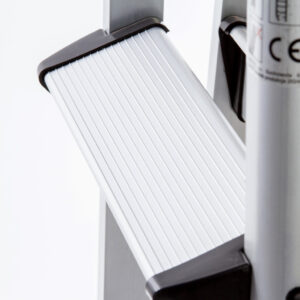 Drabina wyposażona jest w ryflowany, antypoślizgowy podest, który ułatwia wygodną i bezpieczną pracę na drabinie.