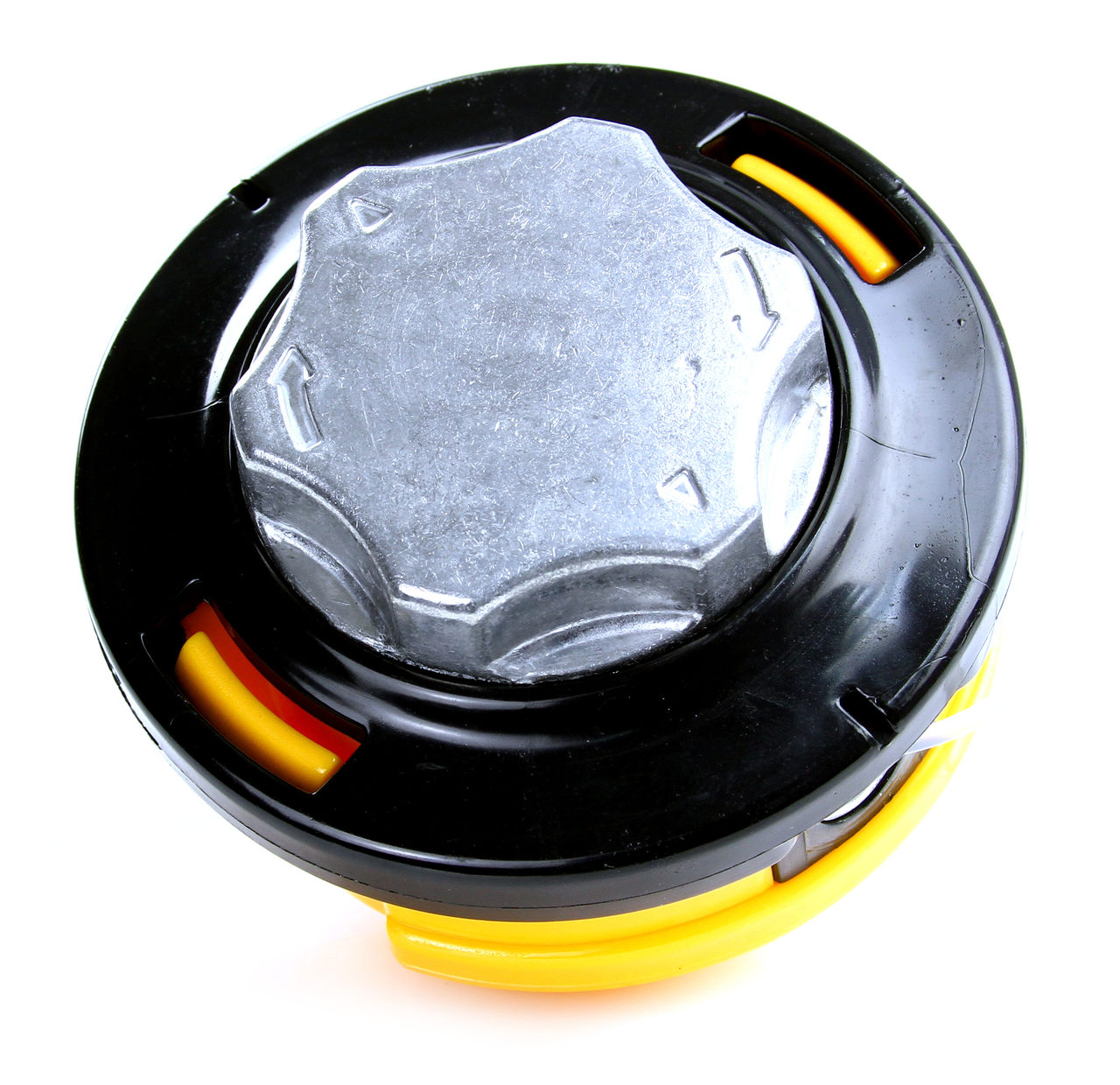 Wymiana żyłki w tej głowicy odbywa się bez konieczności rozbierania głowicy, wystarczy ustawić nakrętkę tak aby zagłębienie na nakrętce pokryło się ze strzałkami na obudowie, odcinamy 6m żyłki przekładamy żyłkę przez przelotki tak aby z jednej strony przelotki było 3 m i drugiej 3 m następnie górną nakrętką zwijamy.