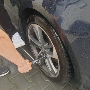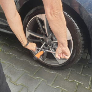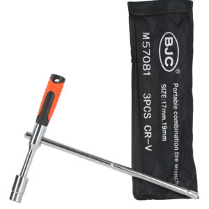 Składany klucz do kół samochodowych. W skład zestawu wchodzi chromowana nasadka o rozmiarach 17 mm, 19 mm,