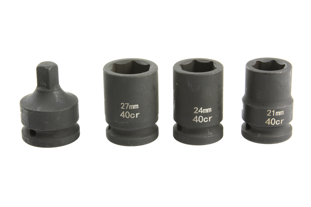 Klucz wyposażony jest w rączkę dla lepszego komfortu pracy oraz 3 nasadki 27mm, 24mm, 21mm i przejściówkę z 3/4″ na 1/2″.