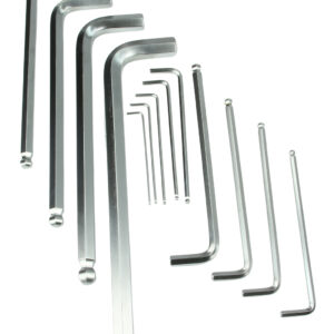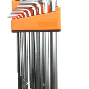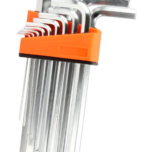 Zestaw kluczy imbusowych o przekroju sześciokąta, z wysokogatunkowej stali chromowo-wanadowej.
