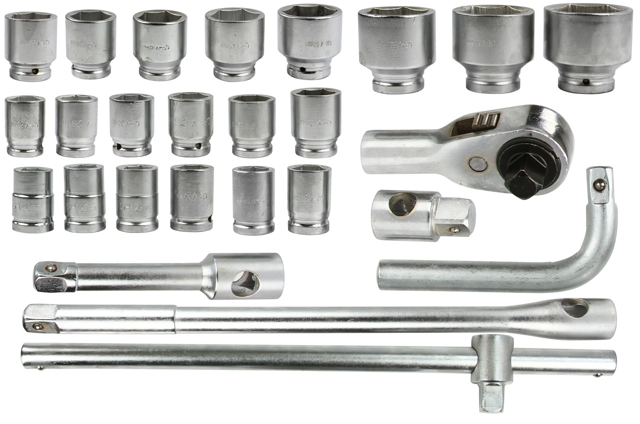 Zestaw kluczy nasadowych marki MAR-POL składający się z 26 elementów. Zestaw zawiera pakiet nasadek 6-kątnych z gniazdem 3/4″ i 1″, pokrętło typu T (3/4″), grzechotkę (3/4″), zestaw przedłużek (3/4″) oraz przelotkę 1″.