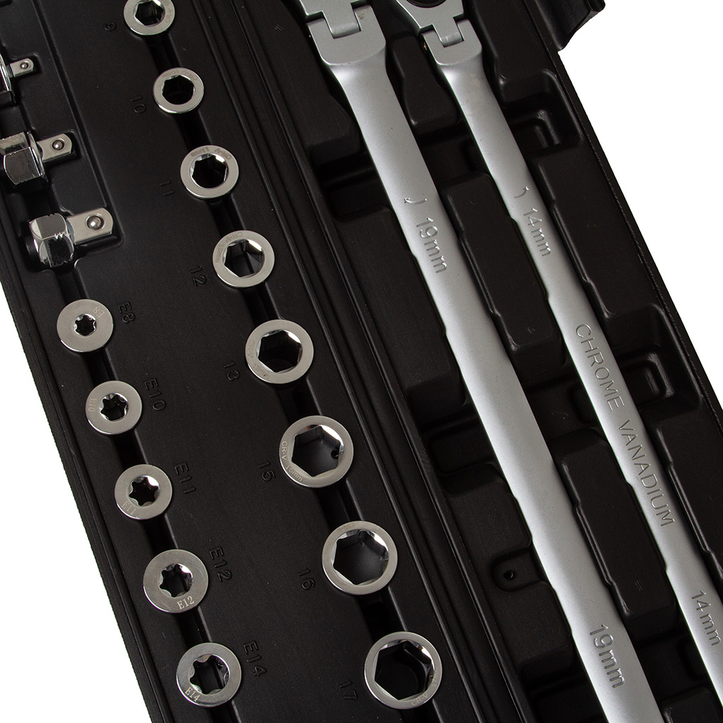 KLUCZE OCZKOWE DŁUGIE Z GRZECHOTKĄ 27ele. ŁAMANE NA PRZEGUBIE 8-22MM, TORX E8-E22 POKRĘTŁO
