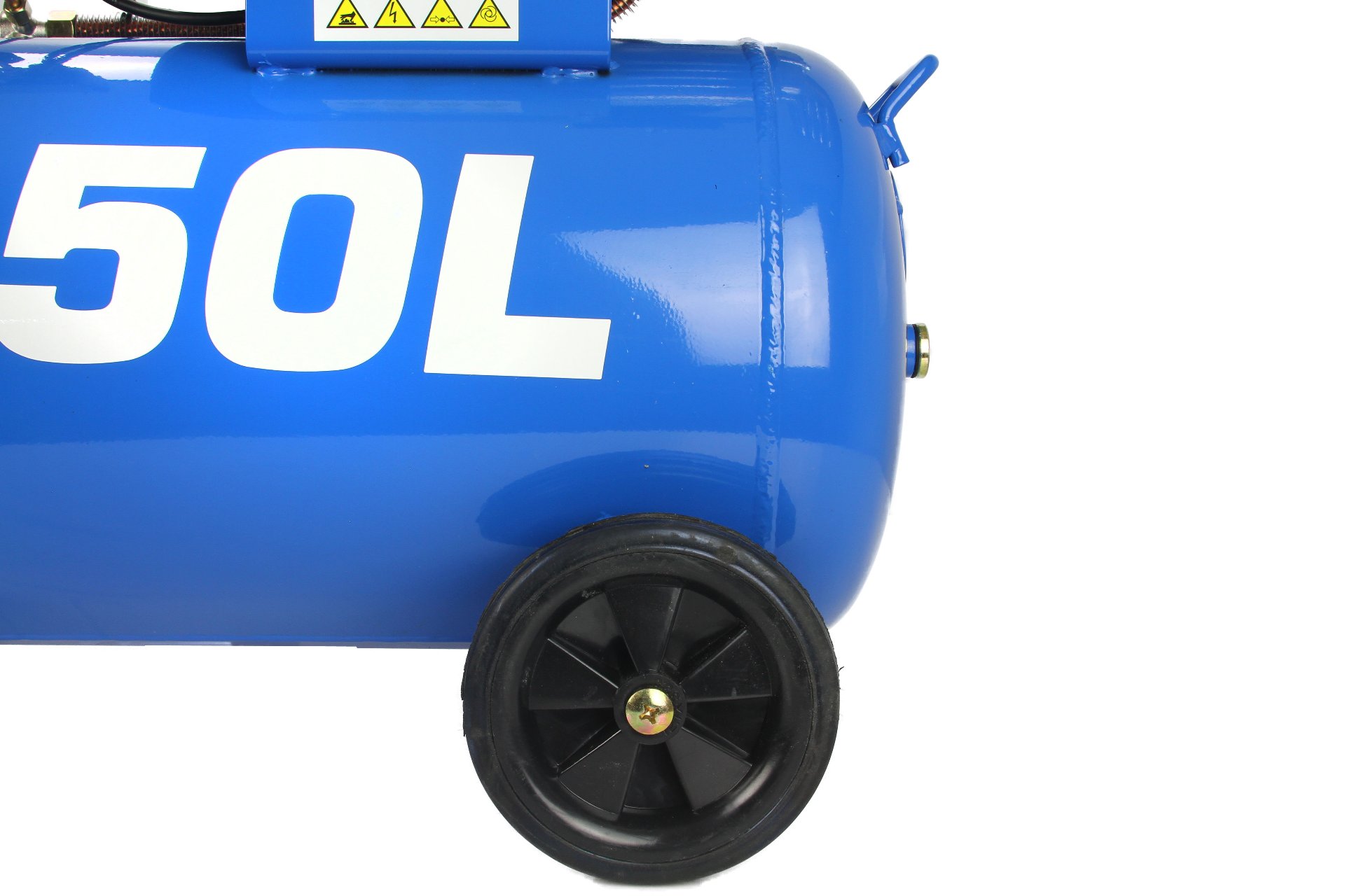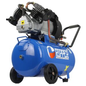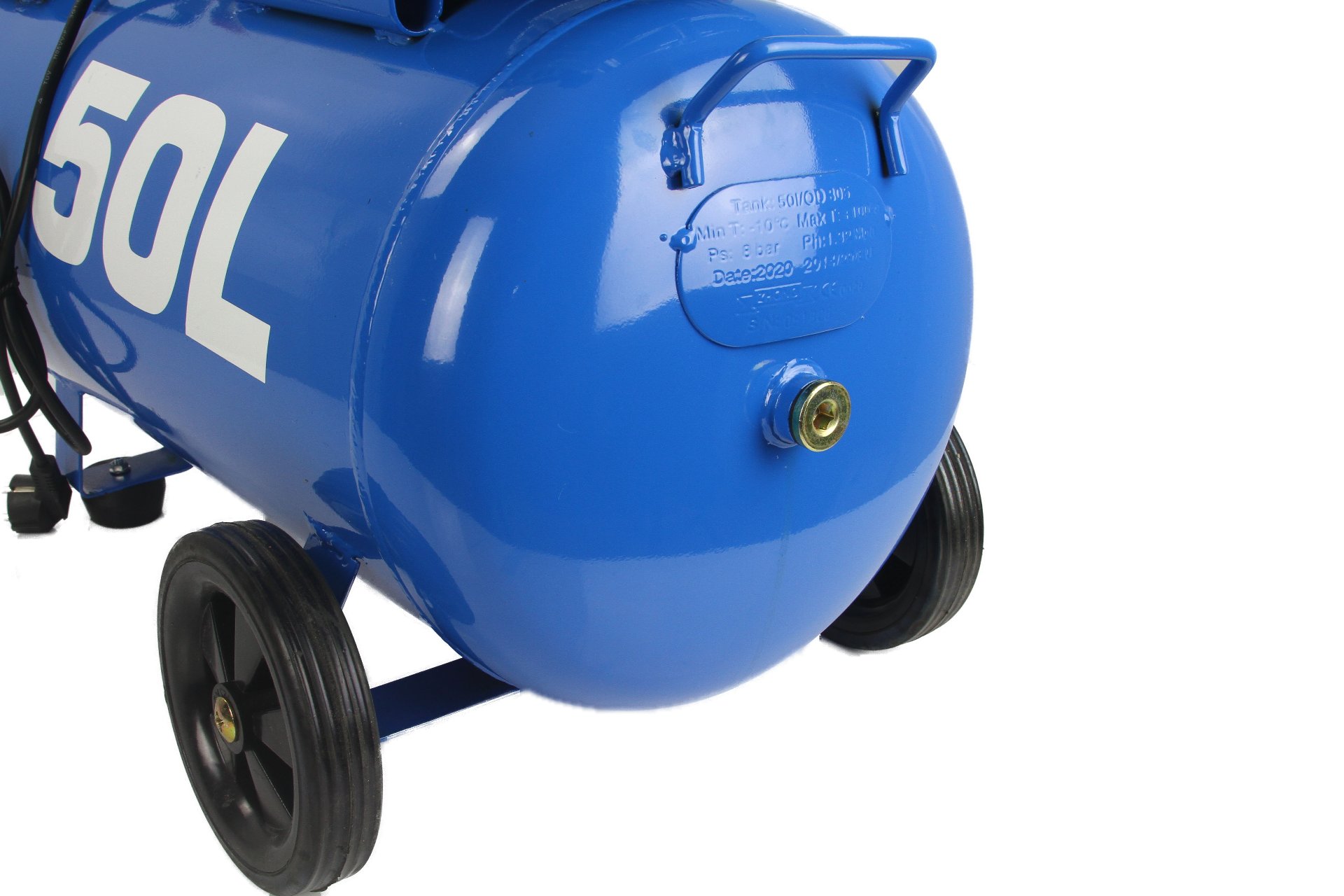 Kompresor o pojemności zbiornika 50L. Dwa cylindry w układzie V zapewnią optymalne chłodzenie oraz zagwarantują bezawaryjną i cichą pracę.