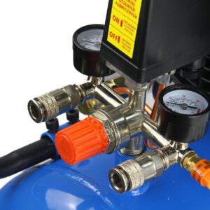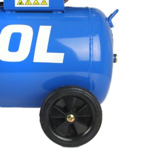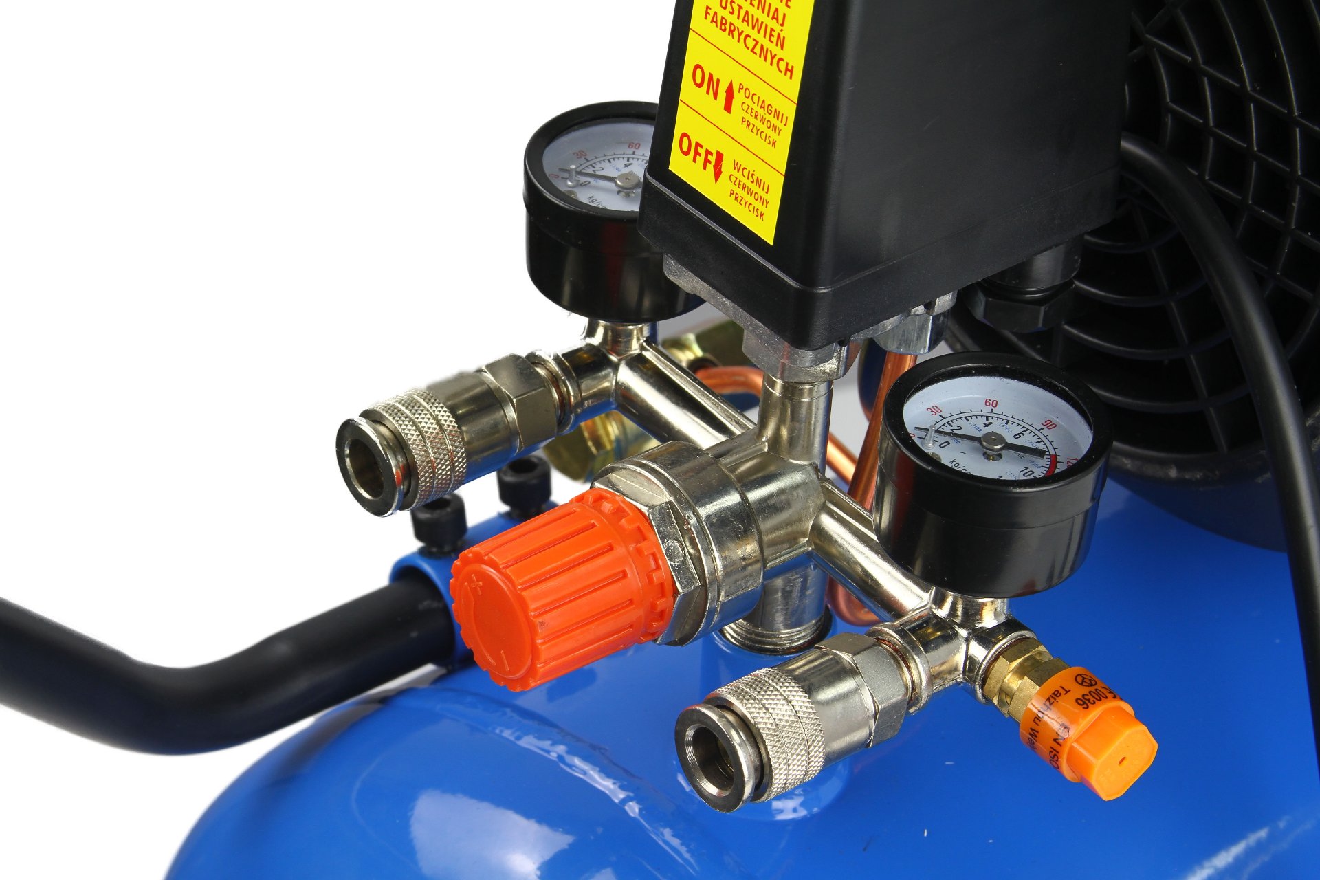 Wyposażony w duże kółka ułatwiające przemieszczanie. Kompresor posiada na wyposażeniu uchwyt do transportowania, włącznik ciśnieniowy,
