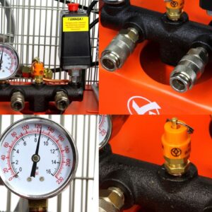 Kompresor BJC 115 L został wyposażony w osprzęt wysokiej jakości, szczelne szybkozłącza ( 2 szt . i dodatkowo wolne jedno wejście na szybkozłącze bezpośrednio w butli ) oraz precyzyjne manometry pozwalające na monitorowanie parametrów pracy kompresora.