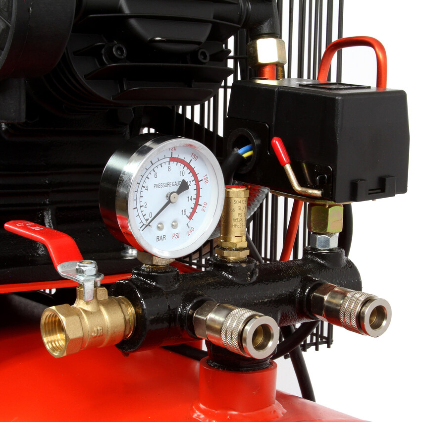 Kompresor MAR-POL został wyposażony w osprzęt wysokiej jakości, szczelne szybkozłącza ( 2 szt. i dodatkowo wolne jedno wejście na szybkozłącze bezpośrednio w butli ) oraz precyzyjne manometry pozwalające na monitorowanie parametrów pracy kompresora.