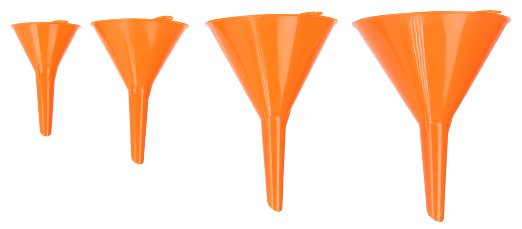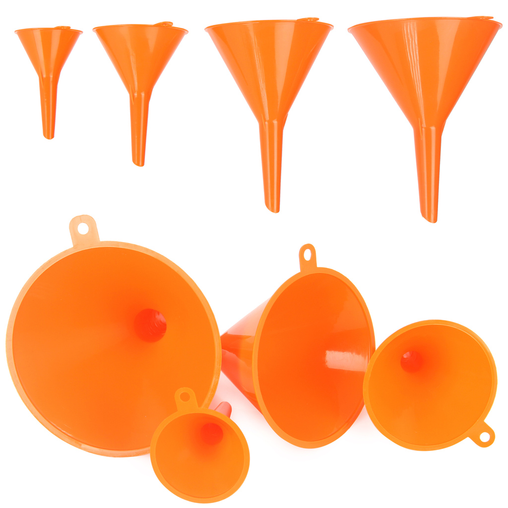 Komplet 4 lejków uniwersalnych które znajdą swoje zastosowanie w każdym gospodarstwie domowym. Idealne sprawdzają się podczas nalewania paliwa do kos, kosiarek, pił czy do uzupełniania płynów w pojazdach.
