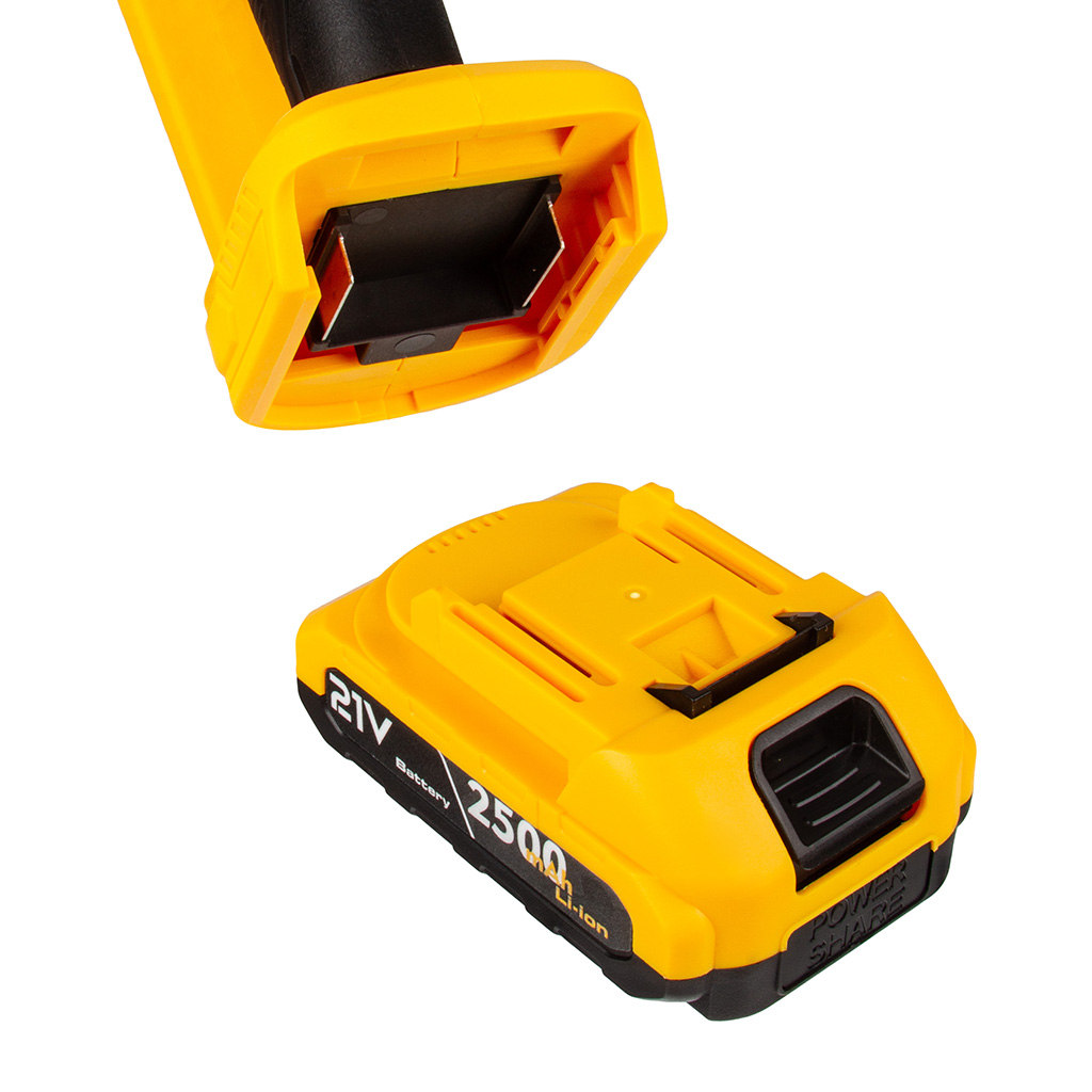 Komfort: Dwie wymienne baterie 21 V 2,5Ah dają aż dwukrotnie dłuższą pracę – do 70 minut bez przerwy na ładowanie