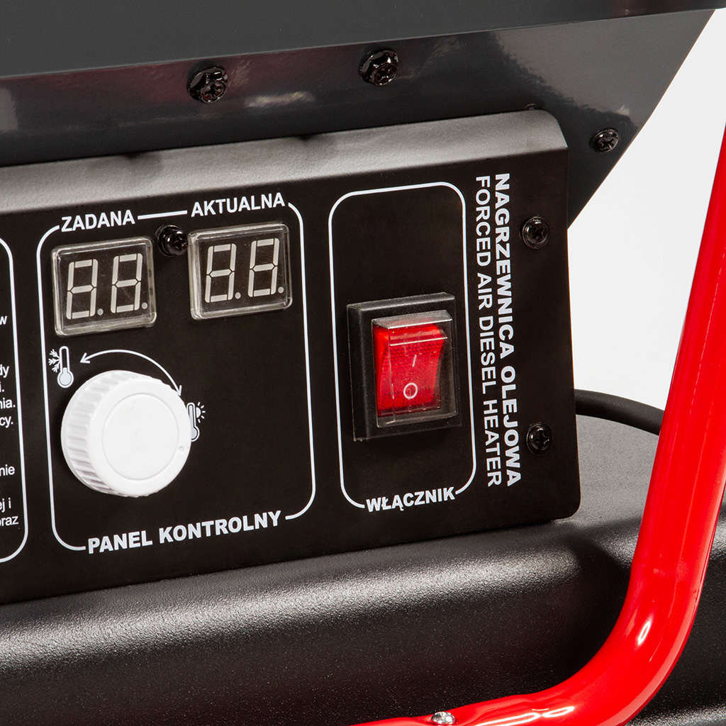 Nagrzewnica wyposażona w regulację temperatury za co odpowiada dodatkowy termostat oraz pokrętło regulacji temperatury.