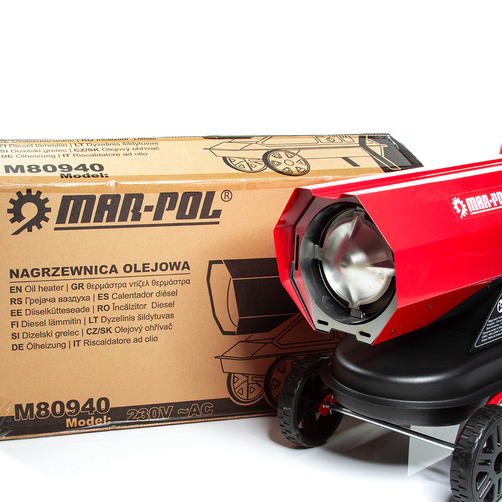 INNOWACYJNA NAGRZEWNICA OLEJOWA FIRMY MAR-POL 40KW Z REGULACJĄ, KOMINEM OCTAGONALNYM I ELEKTRONICZNYM WYŚWIETLACZEM