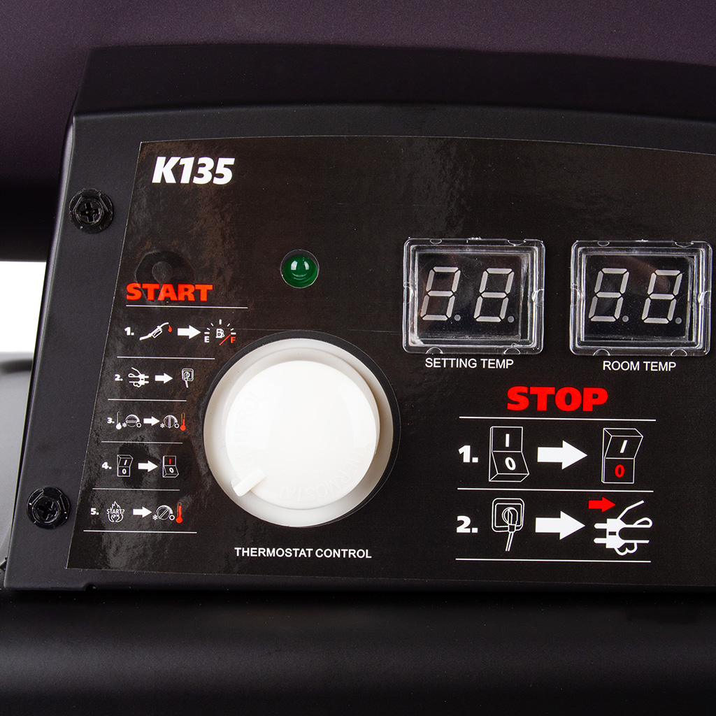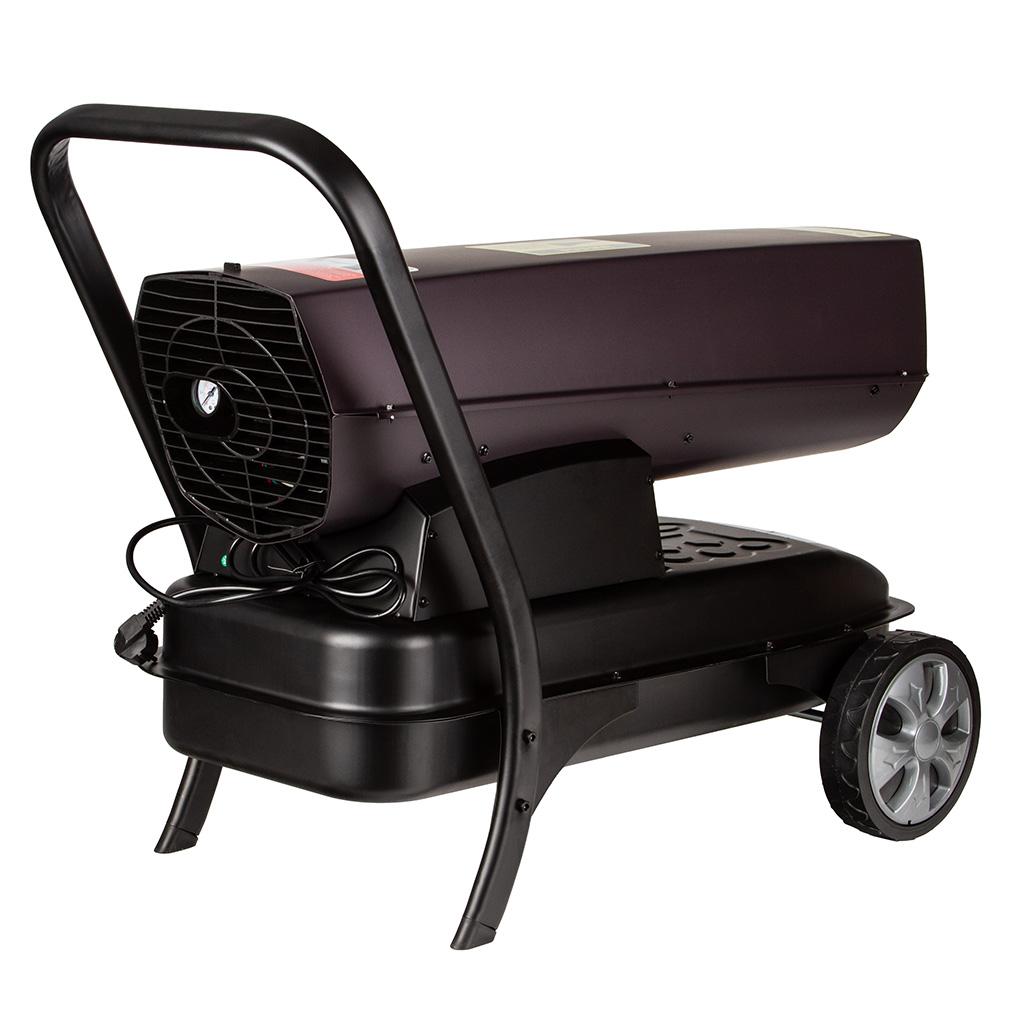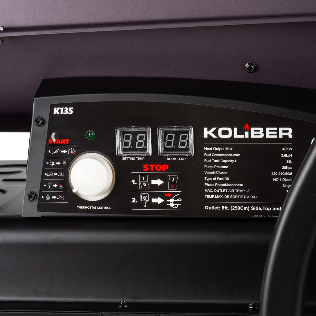 Solidna konstrukcja nagrzewnicy ze zintegrowanymi kołami i 38-litrowym zbiornikiem paliwa pozwala na szybką zmianę ogrzewanego miejsca. Nagrzewnica wyposażona w regulowany termostat, który zapewnia automatyzacje pracy urządzenia. Czytelny wskaźnik precyzyjnie informuje o pozostałej ilości paliwa w zbiorniku. Elektroniczny bezpiecznik płomienia i zintegrowane zabezpieczenie przed przegrzaniem zapewnia maksymalne bezpieczeństwo pracy.