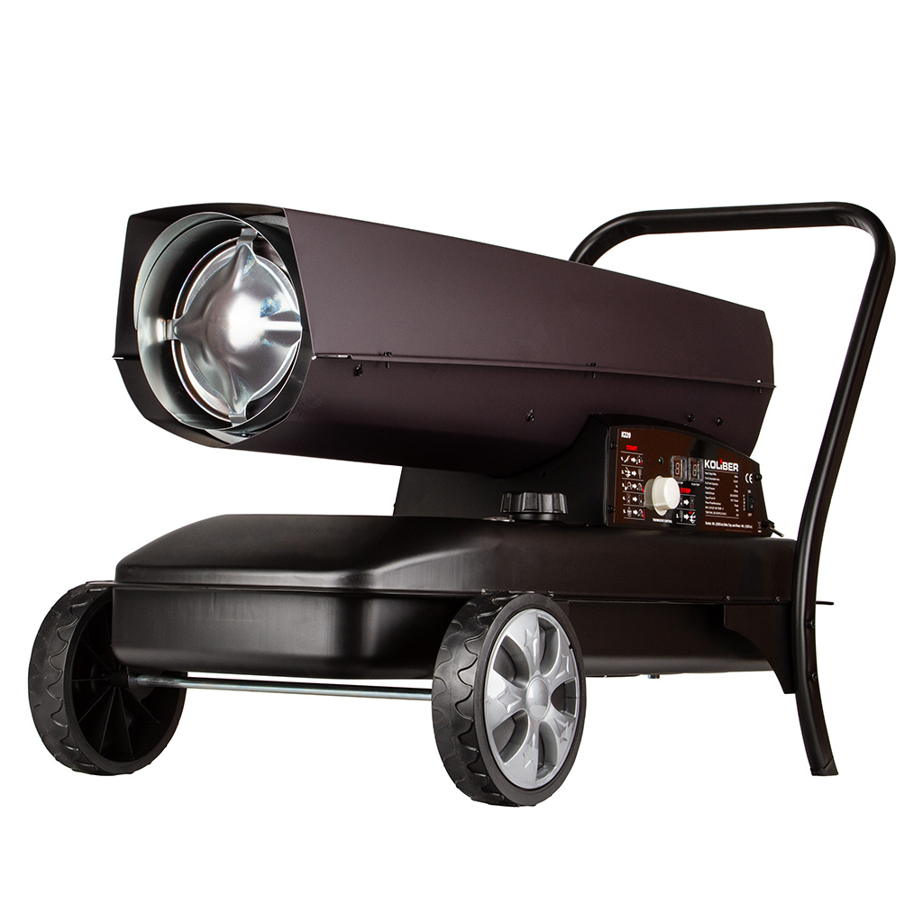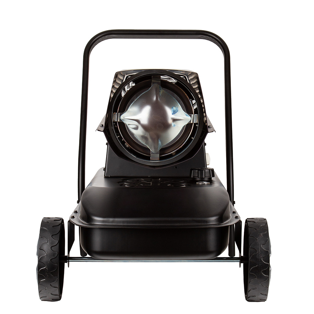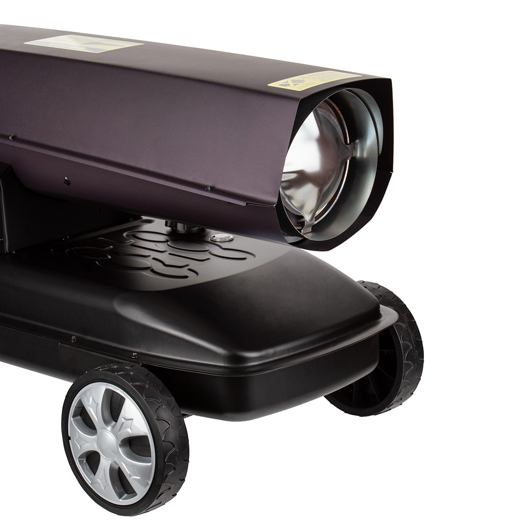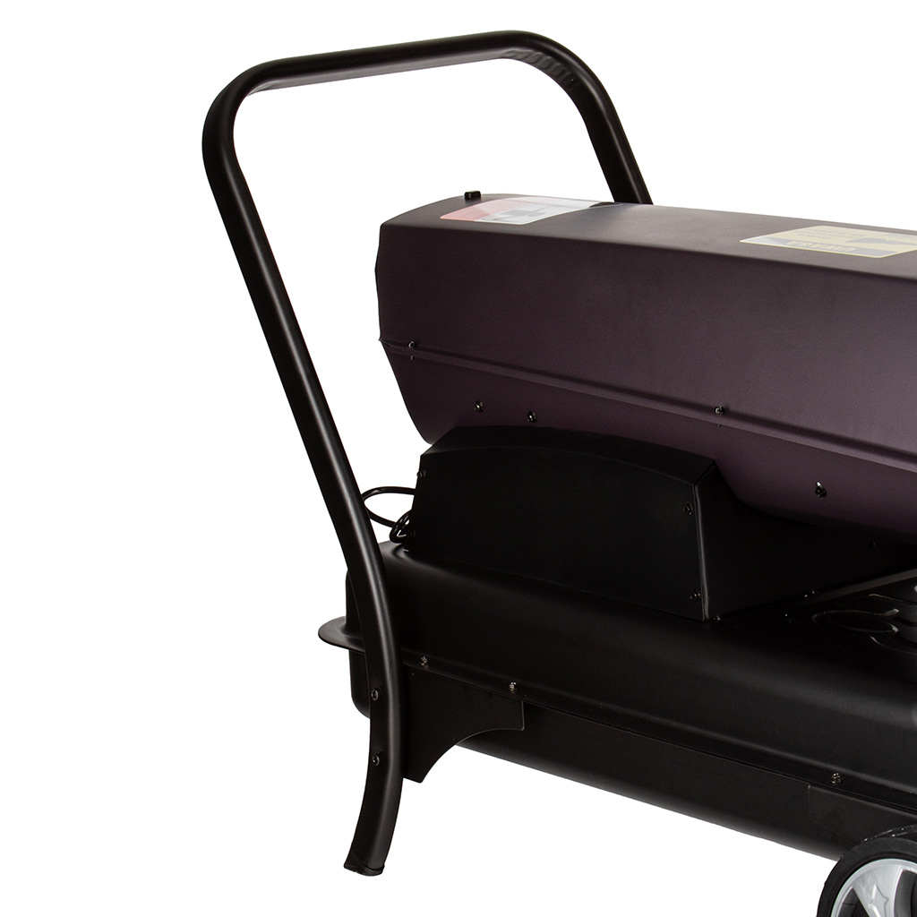 Solidna konstrukcja nagrzewnicy ze zintegrowanymi kołami i 50-litrowym zbiornikiem paliwa pozwala na szybką zmianę ogrzewanego miejsca. Nagrzewnica wyposażona w regulowany termostat, który zapewnia automatyzacje pracy urządzenia. Czytelny wskaźnik precyzyjnie informuje o pozostałej ilości paliwa w zbiorniku. Elektroniczny bezpiecznik płomienia i zintegrowane zabezpieczenie przed przegrzaniem zapewnia maksymalne bezpieczeństwo pracy.