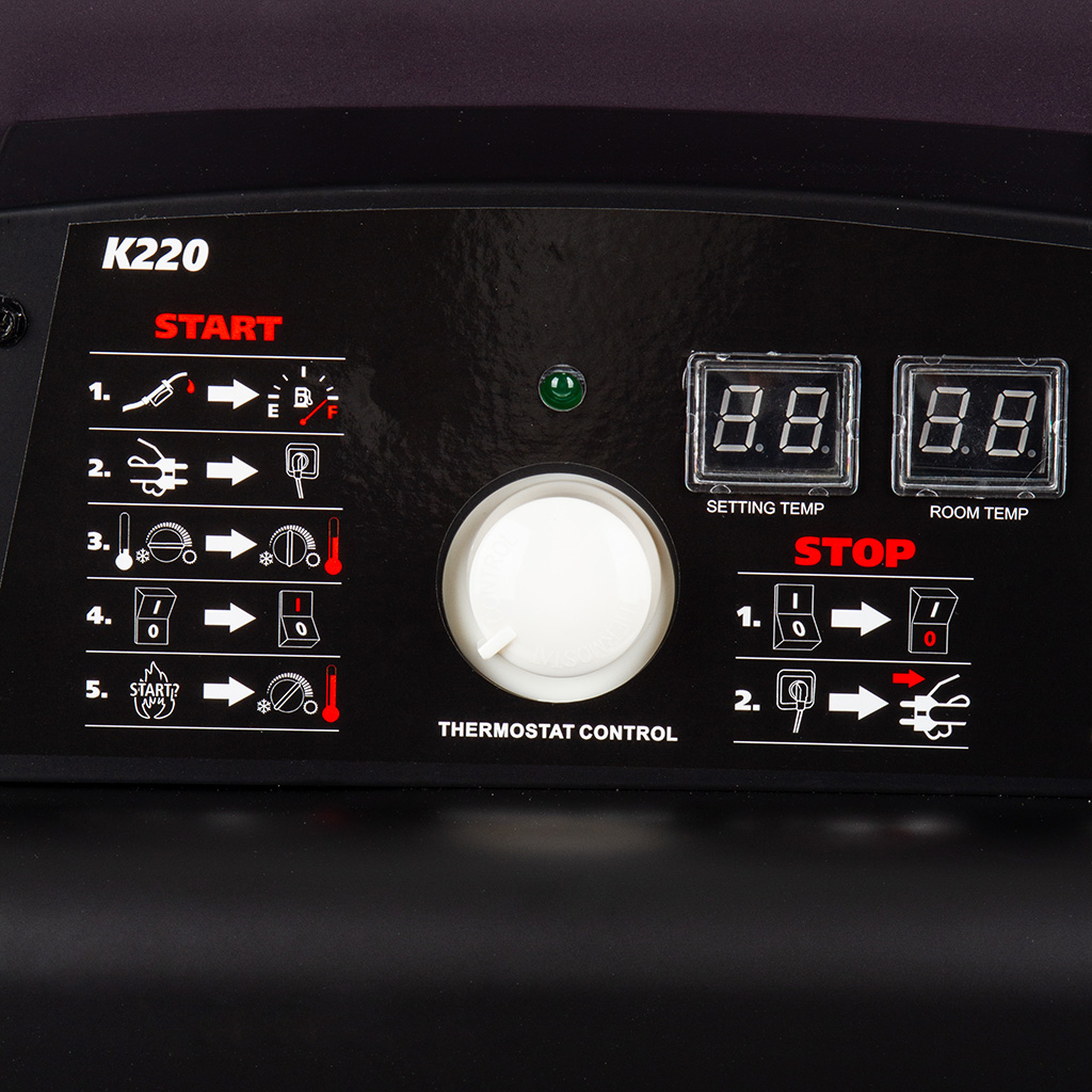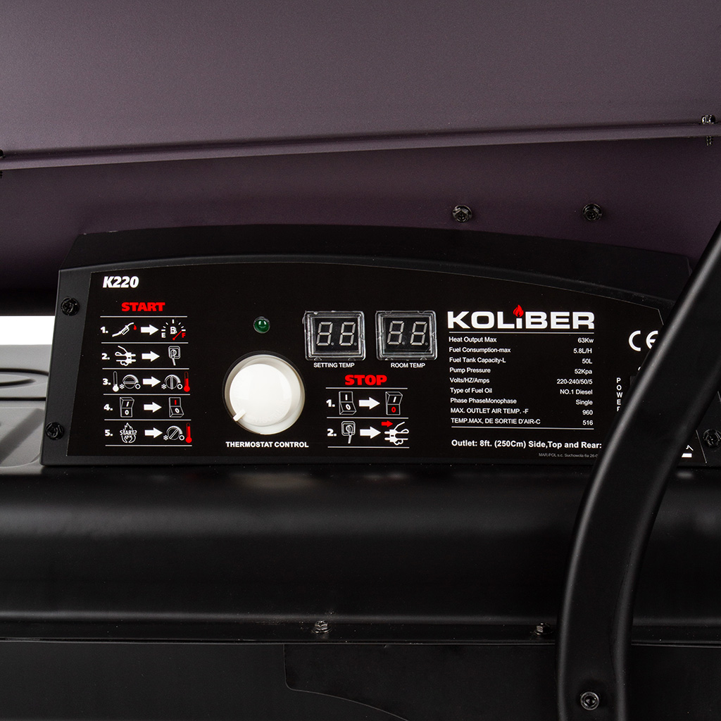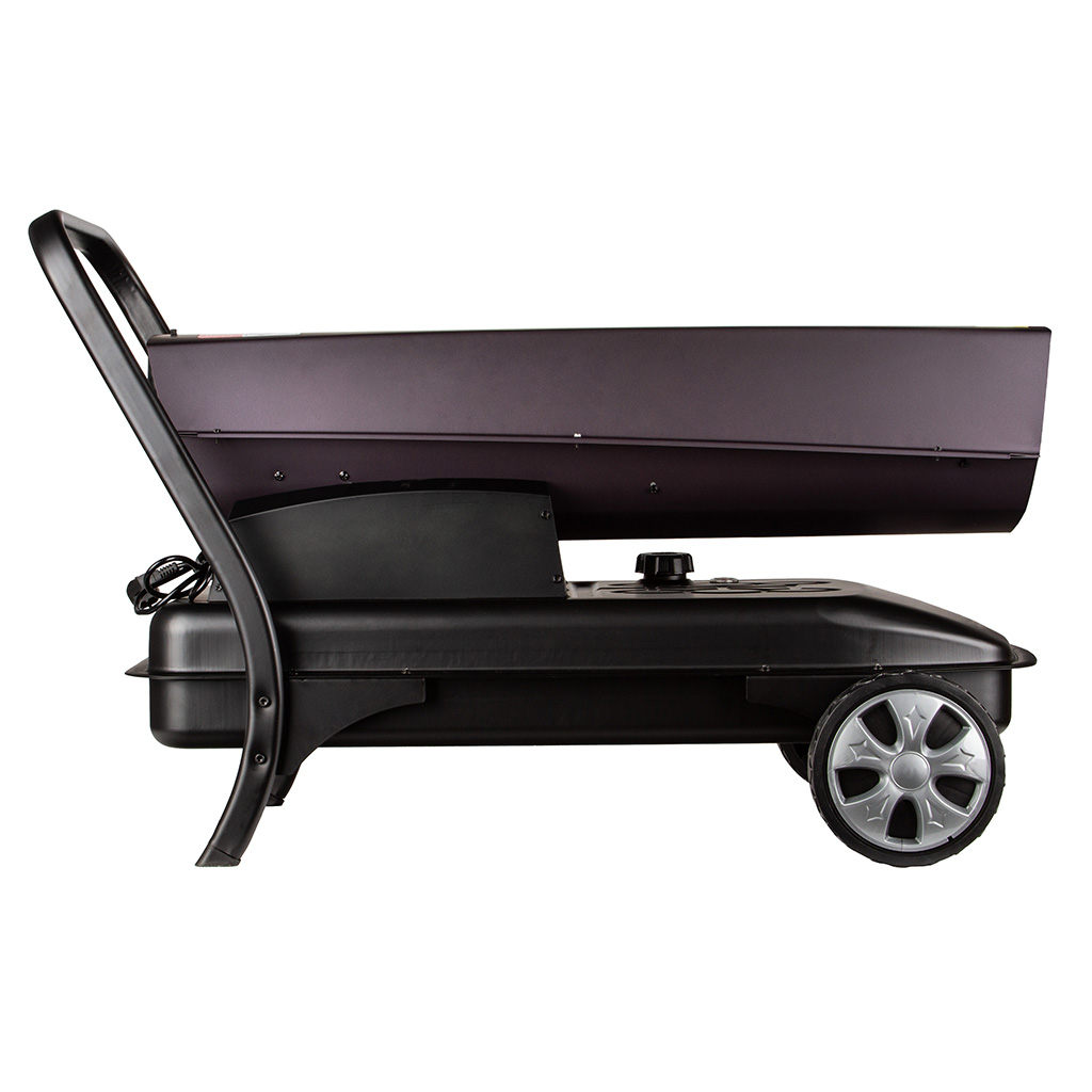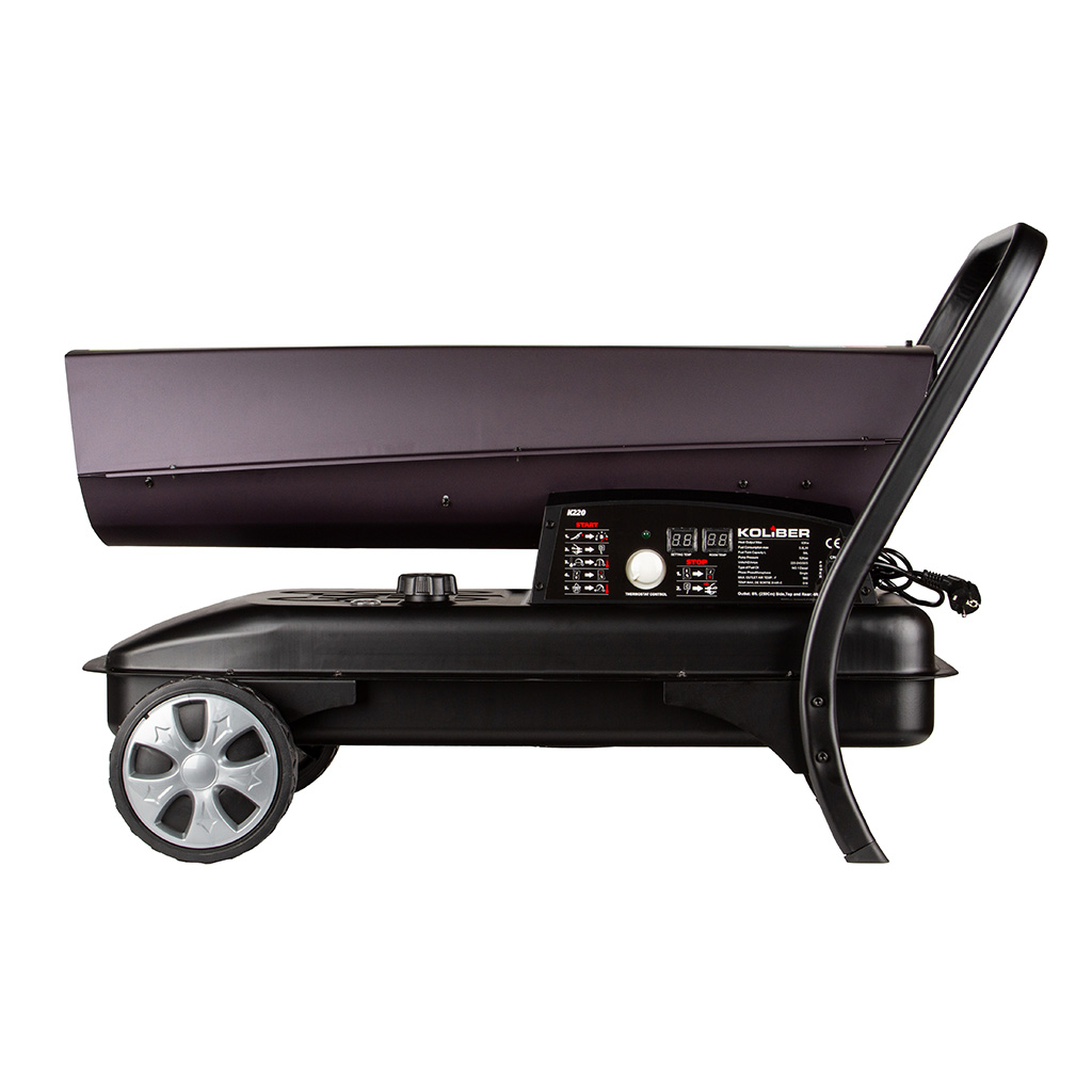 Solidna konstrukcja nagrzewnicy ze zintegrowanymi kołami i 50-litrowym zbiornikiem paliwa pozwala na szybką zmianę ogrzewanego miejsca. Nagrzewnica wyposażona w regulowany termostat, który zapewnia automatyzacje pracy urządzenia. Czytelny wskaźnik precyzyjnie informuje o pozostałej ilości paliwa w zbiorniku. Elektroniczny bezpiecznik płomienia i zintegrowane zabezpieczenie przed przegrzaniem zapewnia maksymalne bezpieczeństwo pracy.