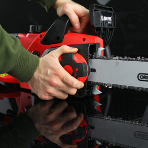 Zastosowany hamulec blokuje silnik, przez co łańcuch nie poruszy się dopóki nie zostanie zwolniony. Dodatkowo hamulec osłania rękę podczas cięcia.