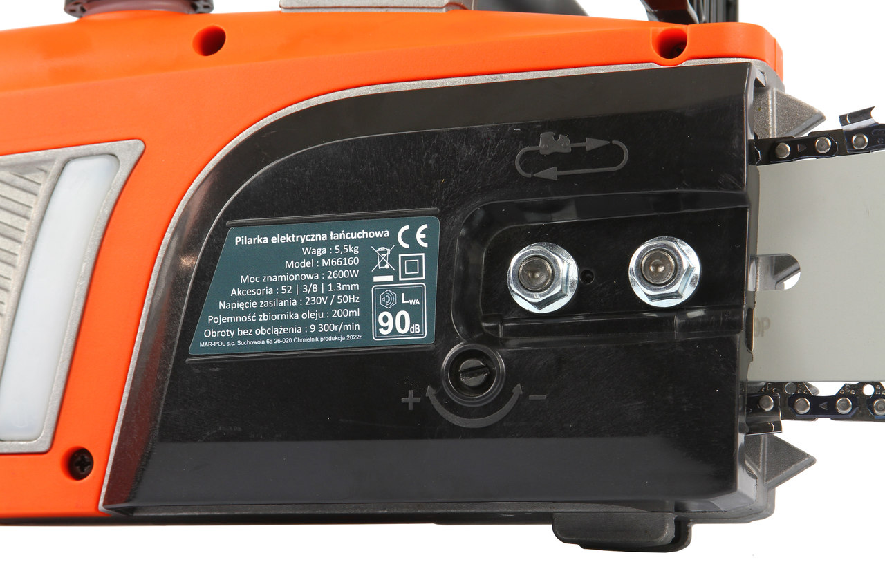 Wysoka jakość materiałów użytych do wykonania tego modelu pilarki elektrycznej pozwala na bezpieczną i efektywną pracę z nim przez wiele lat bez konieczności wymiany sprzętu na nowy po kilku sezonach. Pilarka elektryczna wyposażona jest w silnik o mocy 2600W i napięciu na poziomie 230V~50Hz oraz prowadnicę, która ma 35 cm długości.