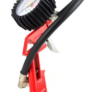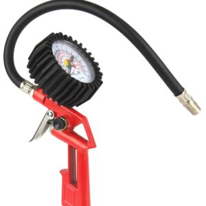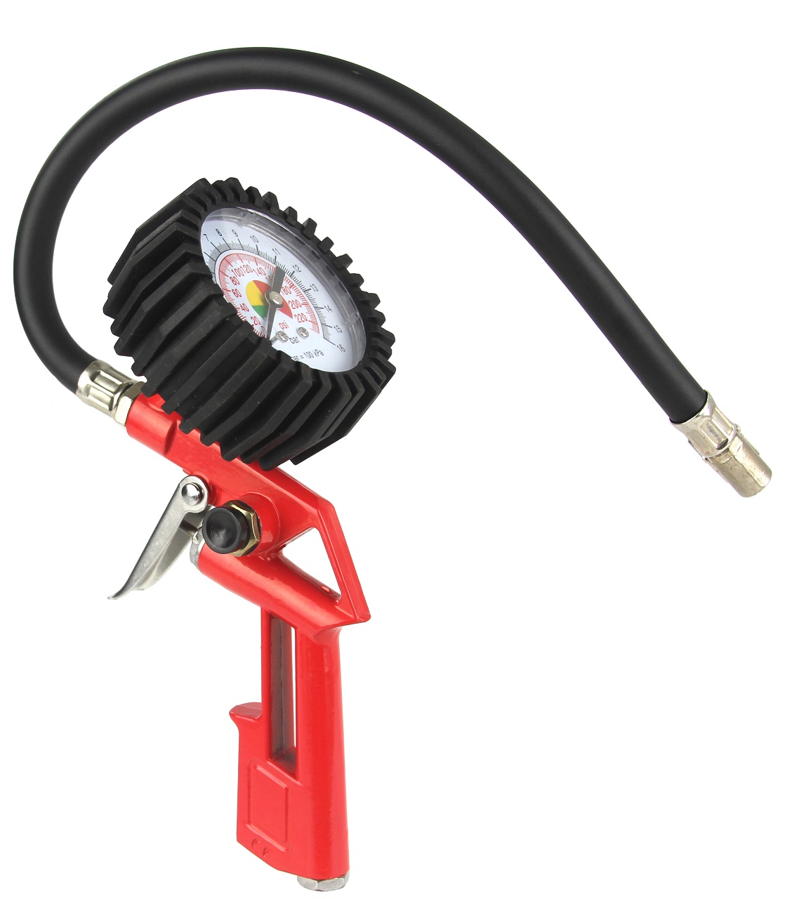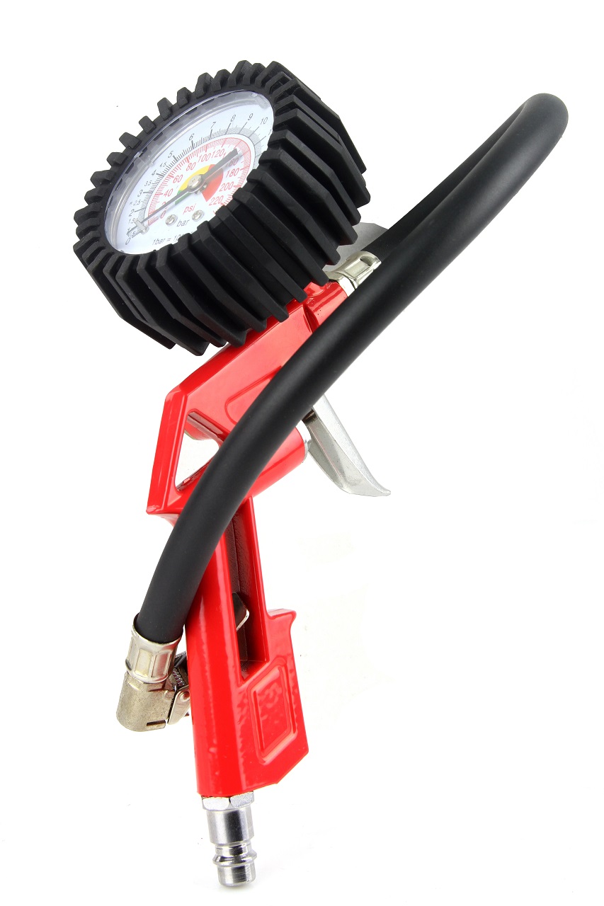Pistolet z manometrem do pompowania kół. Manometr zabezpieczony gumowym korpusem. Długość węża 40cm.