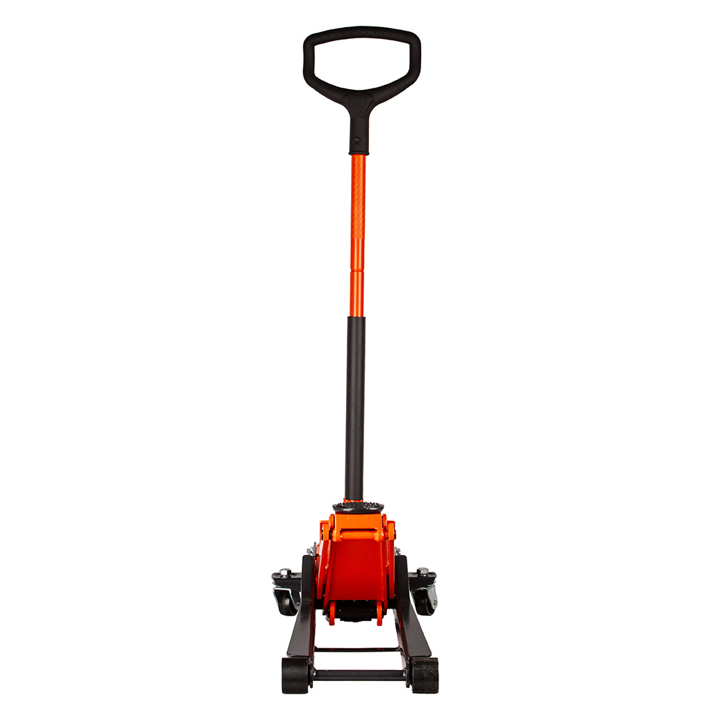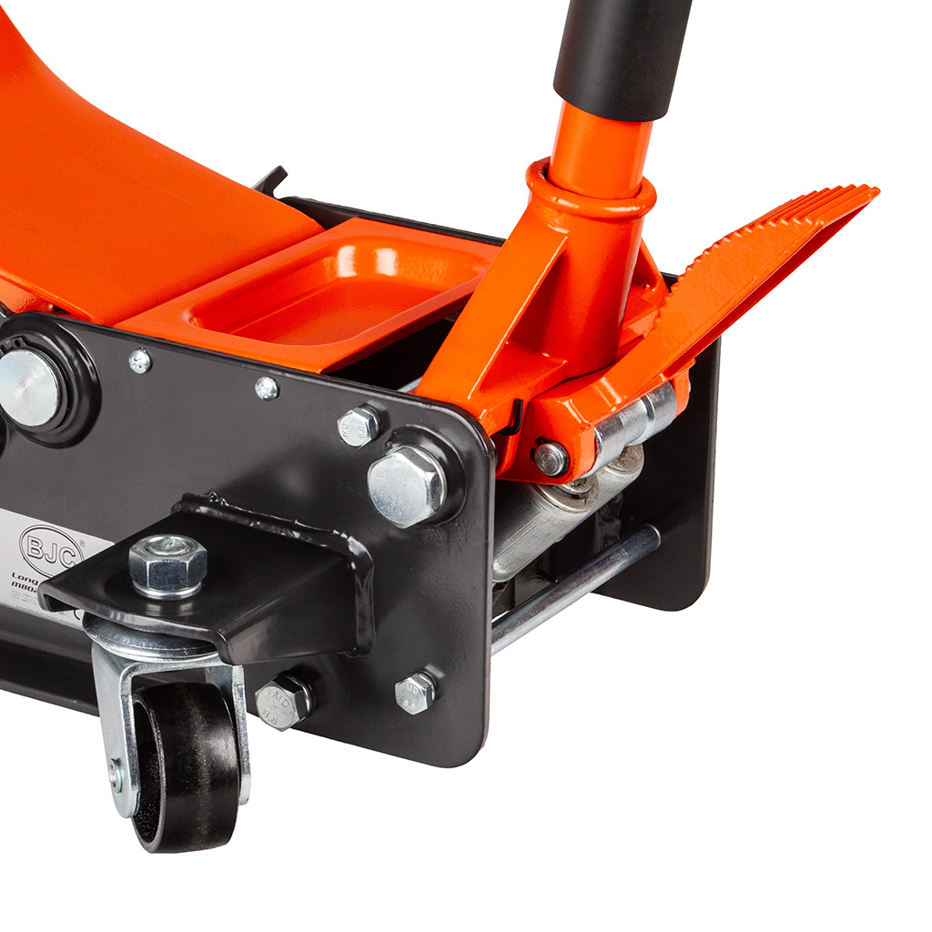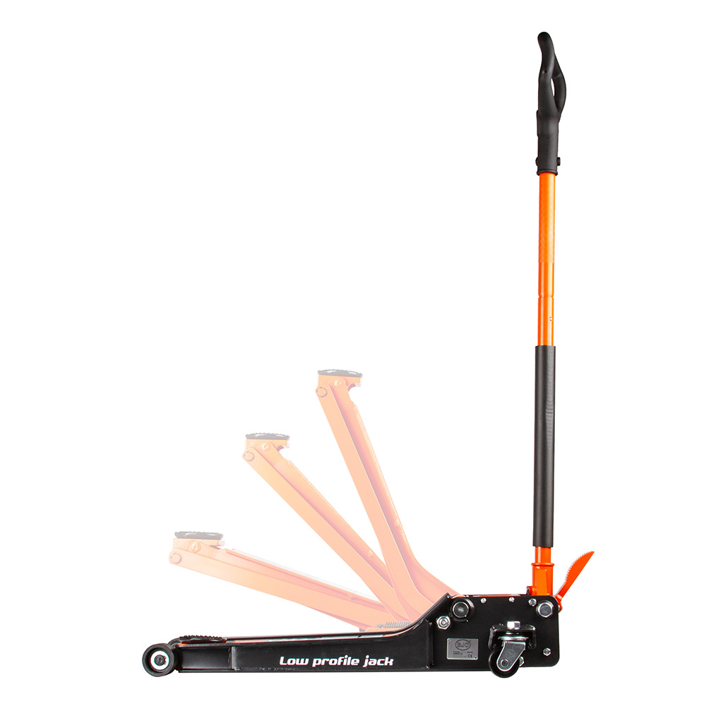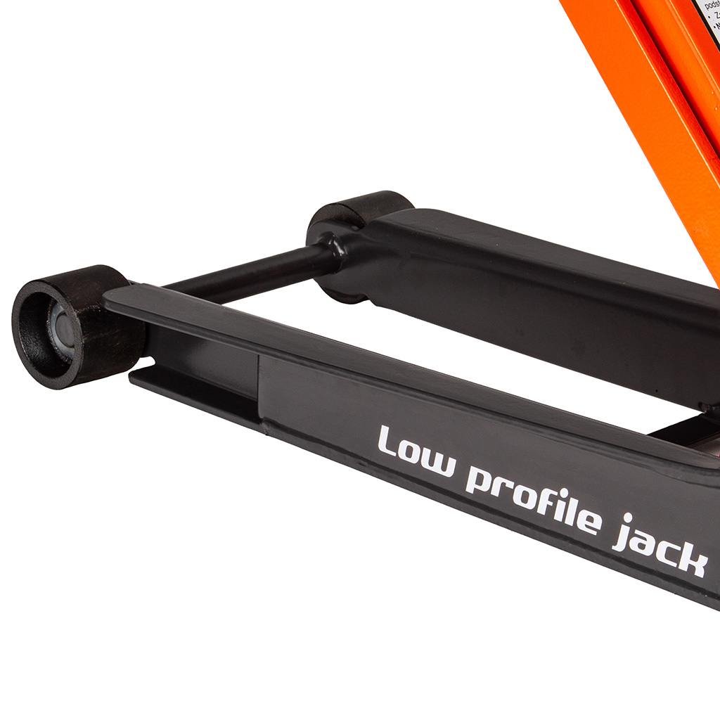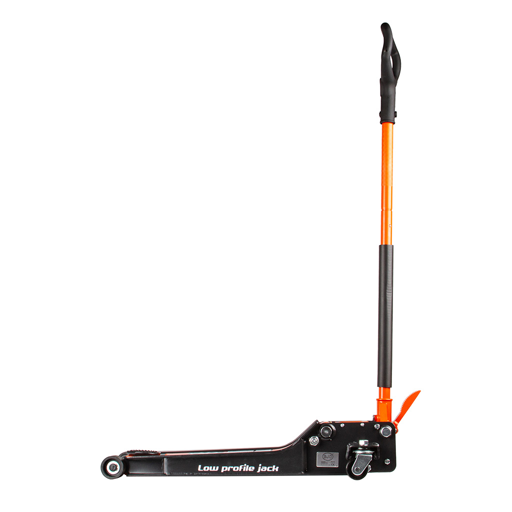 Podnośnik wyposażony jest niezwykle długie ramie o długości około 60 cm, podwójną pompę, co sprawia że siłownik pracuje 2 x szybciej niż w przypadku pojedynczej pompy. Dzięki obrotowym tylnym kółkom podnośnik pozwala nam na pracę w bardzo zróżnicowanych zakresach, idealny do samochodów o niskim profilu ze sportowym zawieszeniem. Posiada zawór spustowy zintegrowany z zaworem bezpieczeństwa. Profesjonalne, solidne narzędzie wykonane z bardzo mocnego i odpornego na złe warunki atmosferyczne materiału. Praktyczna kalamitka do smarowania. Podnośnik posiada podręczne miejsce na śruby, podkładki itp. dzięki czemu nie zgubimy części i zachowamy porządek na miejscu pracy. Wysokość minimalna podnośnika wynosi jedyne 7 cm. Podnośnik jest niski nie tylko na końcu ale na niemal całej długości – dzięki takiemu rozwiązaniu możemy pewnie i bez żadnych obaw wsunąć go pod niskie sportowe zawieszenia.