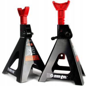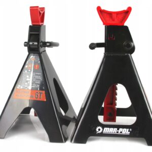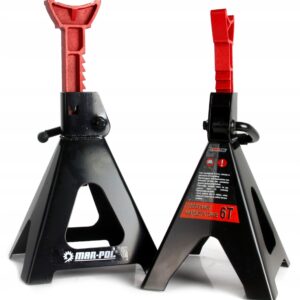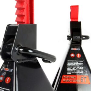 Podstawki zapewniają bezpieczne i stabilne podparcie auta na specjalnie wyprofilowanych siodełkach. Dźwignia blokująca skutecznie zabezpiecza kolumny podpór w wybranym położeniu. Wykonane są z wytrzymałej stali i charakteryzują się solidną, spawaną konstrukcją. Nogi podstawek posiadają przyspawane, szerokie stopki, stabilizujące kobyłki w trakcie pracy pod obciążeniem.