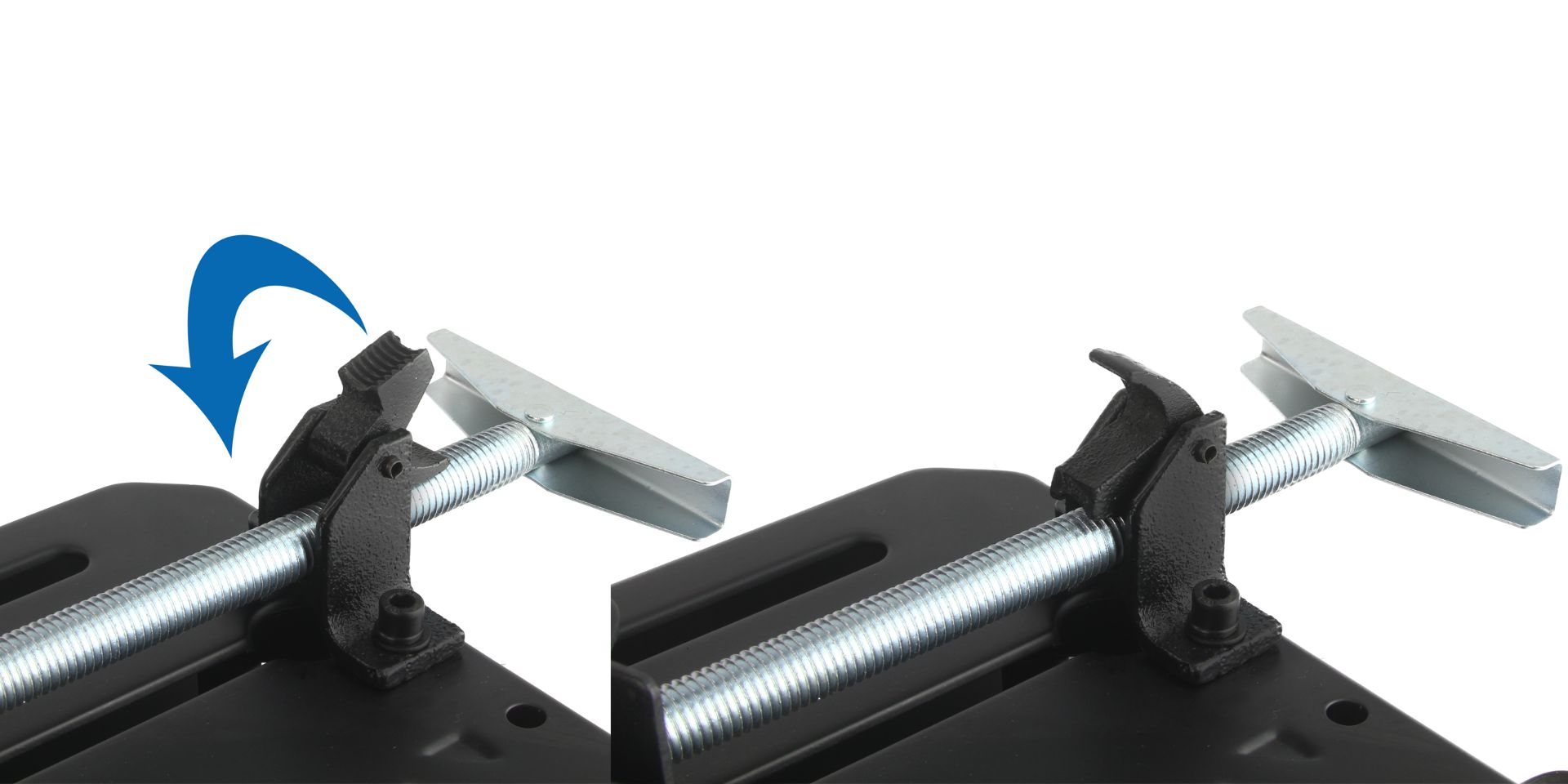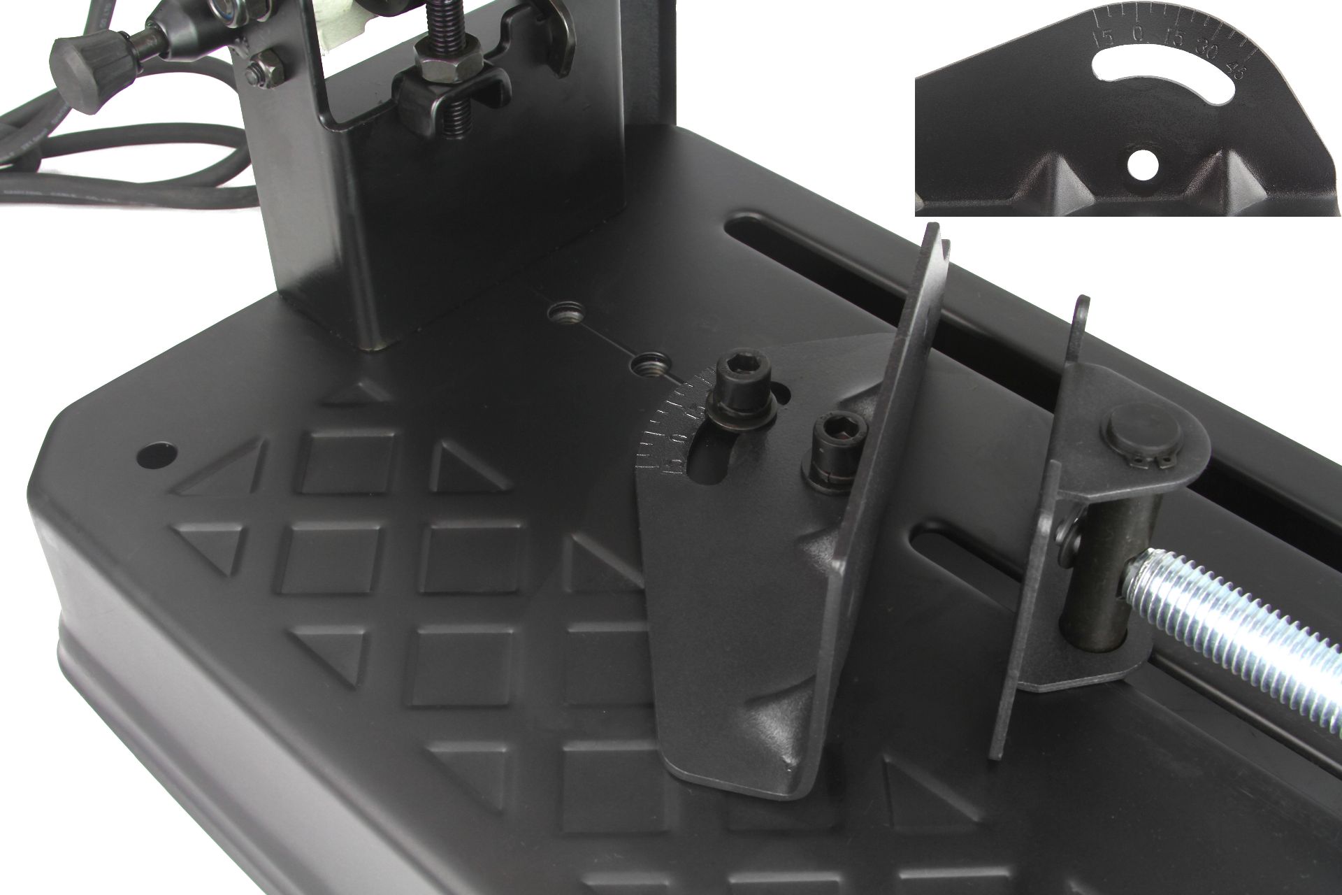 Piła została wyposażona w imadło z kątomierzem za pomocą, którego możemy ustawić cięty przedmiot pod odpowiednim kątem i ustabilizować go za pomocą śruby dociskowej