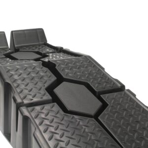 żłobienia w tworzywie zwiększajace przyczepność. Unikalna konstrukcja ułatwiająca przechowywanie i magazynowanie ramp. Duża