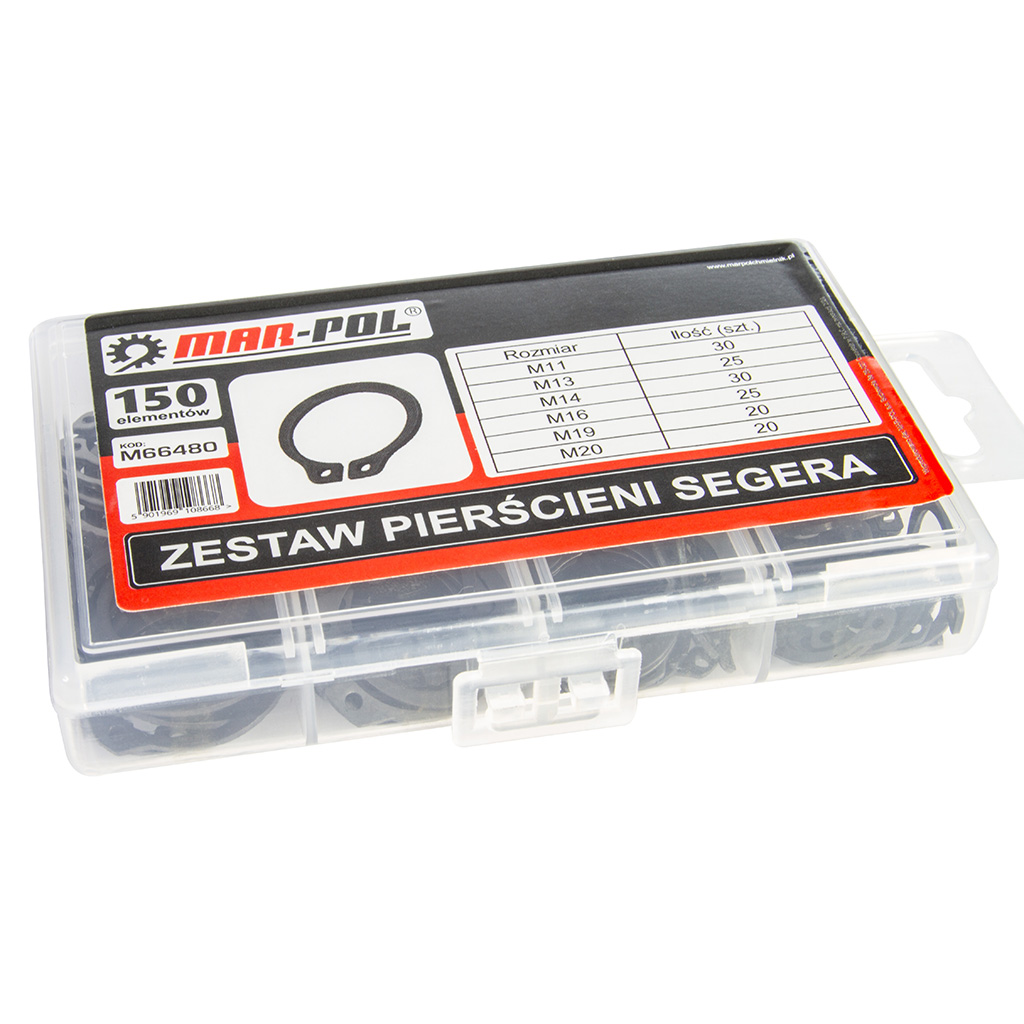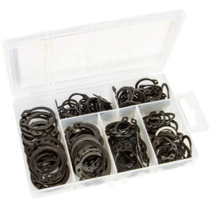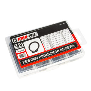 Zestaw 150 pierścieni Segera zewnętrznych, złożony z 6 różnych rozmiarów od M11 do M20, elementy ułożone są w praktycznym sortowniku/pudełku, wyposażonym w przegródki, co znacznie ułatwi pracę, transport i przechowywanie.