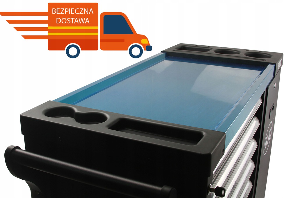 Centralny zamek z dwoma kluczami zamykający wszystkie szuflady oraz podwójne ścianki zabezpieczają narzędzia przed niepożądanym dostępem lub kradzieżą, zapasowy kluczyk w zestawie w przypadku zgubienia jednej sztuki.