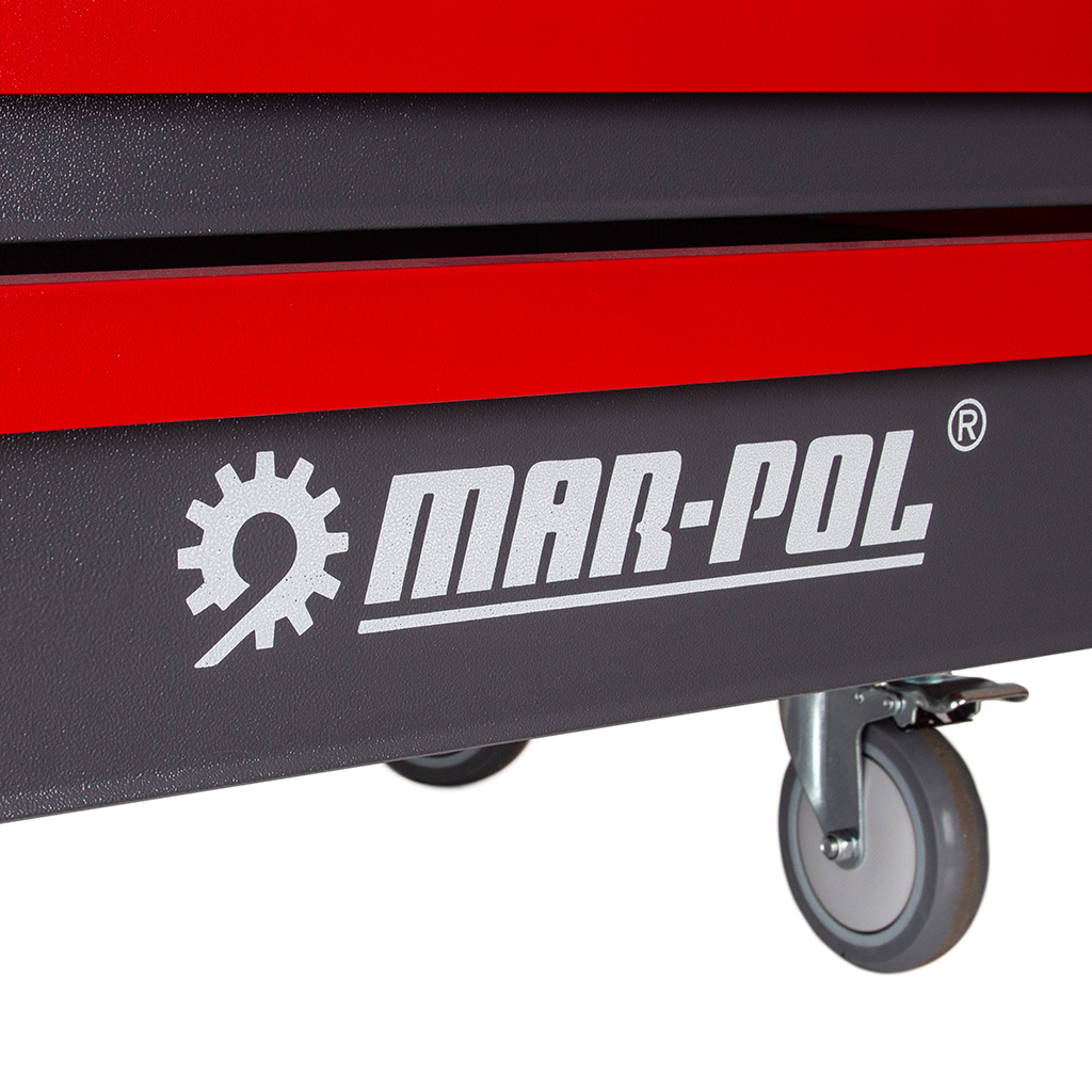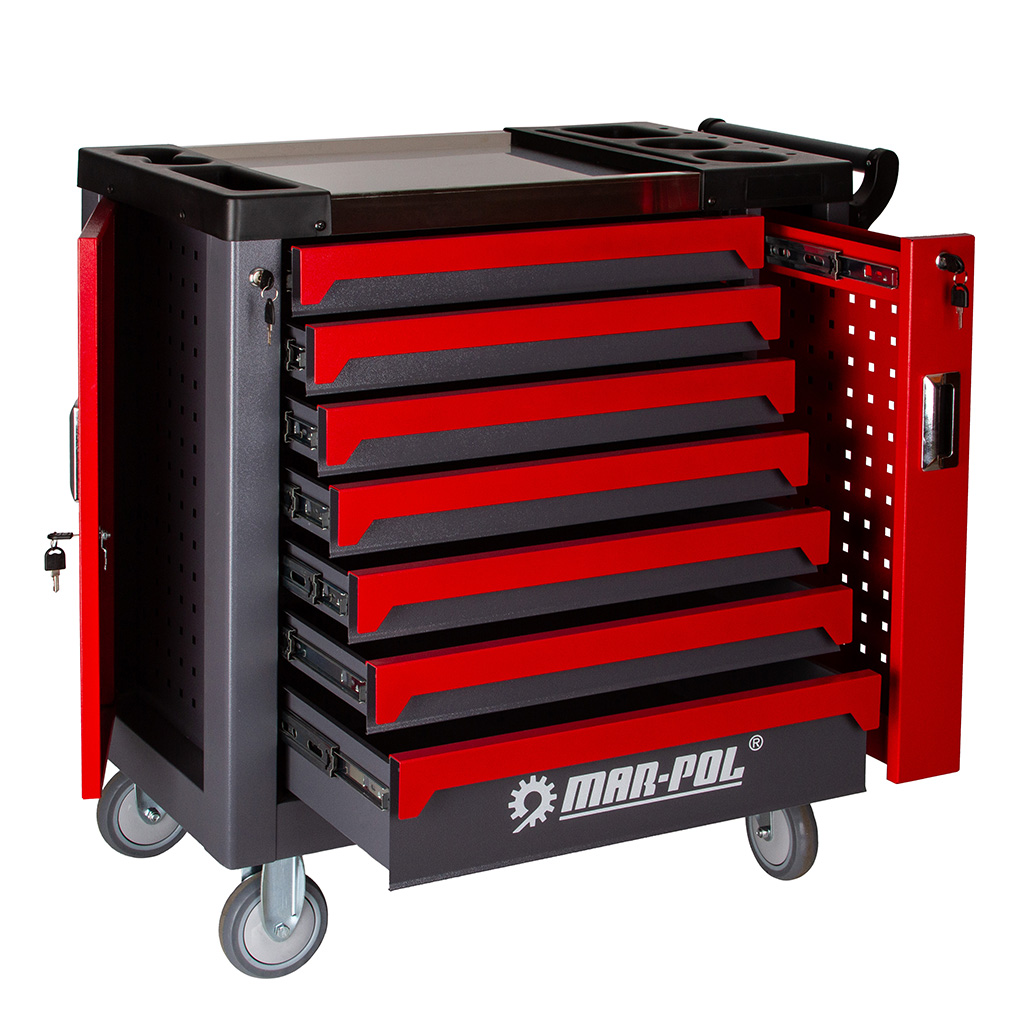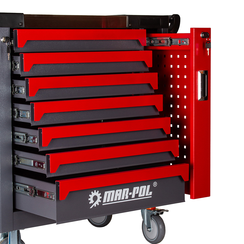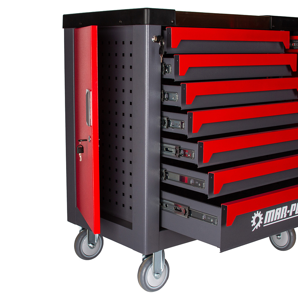 Ten wózek warsztatowy został stworzony z myślą o profesjonalistach, ale sprawdzi się także idealnie w Twoim garażu, domowym warsztacie czy gospodarstwie rolnym. Jego funkcjonalność, wytrzymałość i praktyczne rozwiązania sprawią, że praca stanie się jeszcze bardziej efektywna i przyjemna. Daj sobie szansę na lepszą organizację i wygodę podczas prac w warsztacie. Wybierz szafkę warsztatową i zyskaj solidność oraz funkcjonalność, której potrzebujesz! Profesjonalny wózek warsztatowy z 7 szufladami na łożyskach kulkowych i składzikiem zamykanym na kluczyk. Centralny zamek. Duże kierowane koła, automatyczna blokada, hamulec zapewniają przy przemieszaniu szafy komfort bezpieczeństwa nawet na małych pochyłościach. Stalowy blat odporny na środki chemiczne, oleje, wysoką temperaturę oraz uszkodzenia. Sama konstrukcja i szuflady są wykonane z blachy co sprawia, że szafa jest stabilna i wytrzymała.