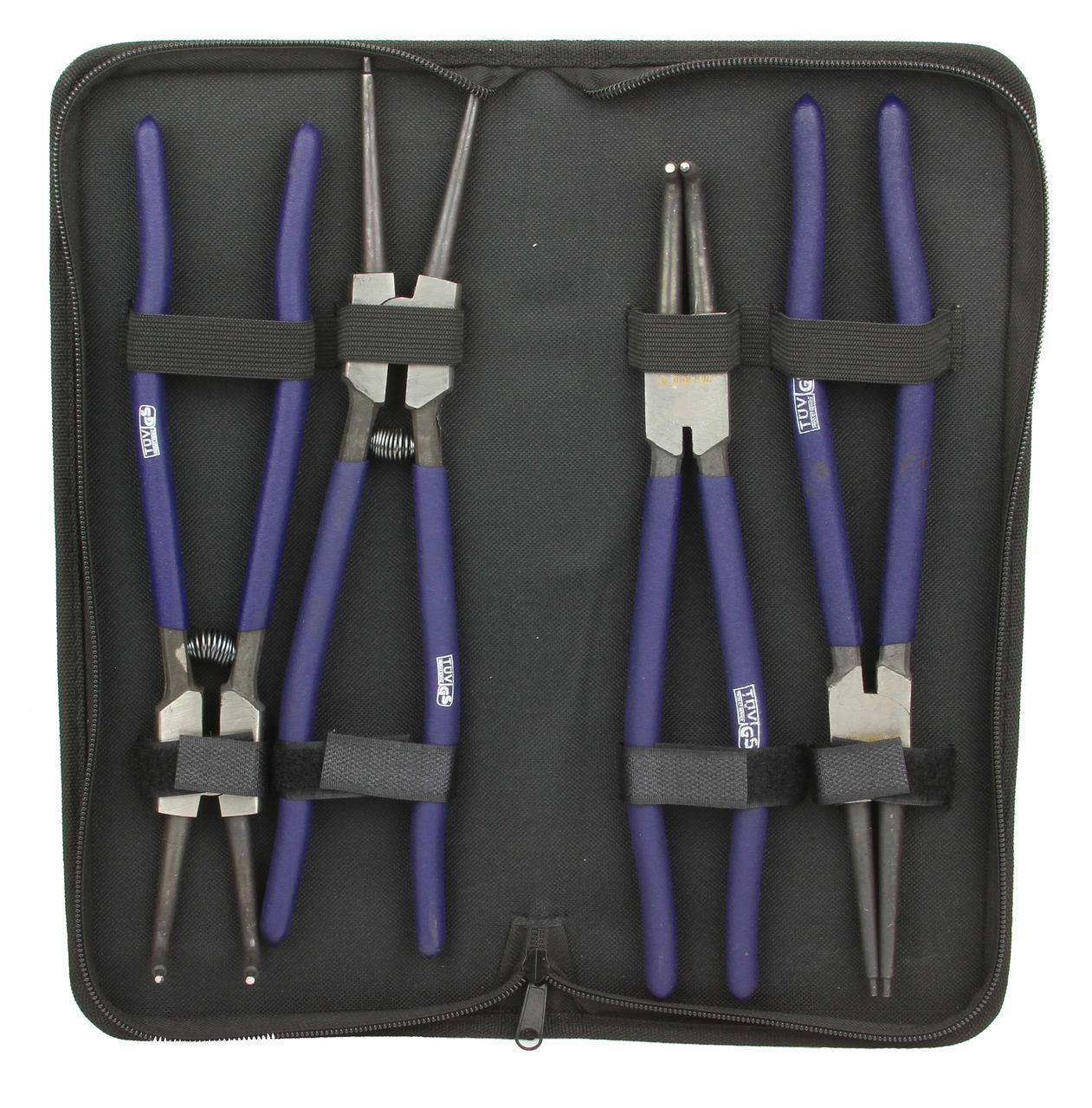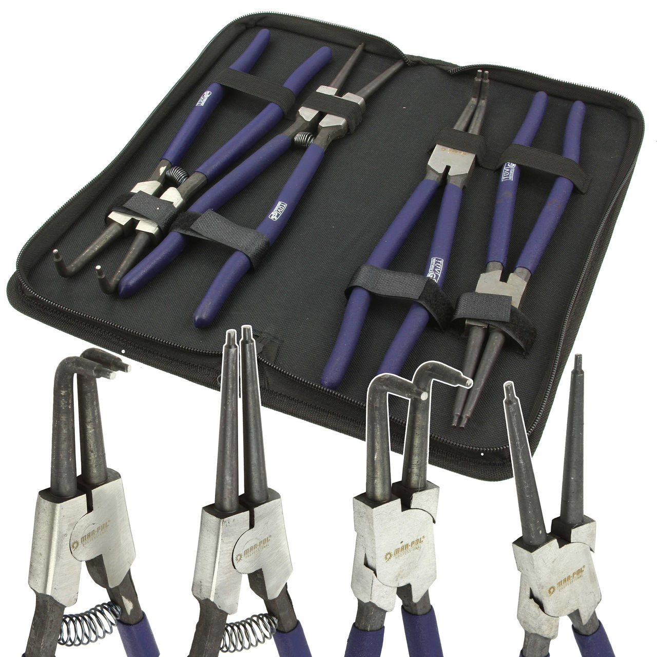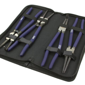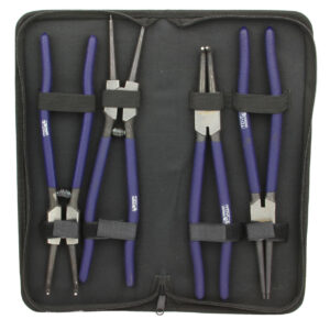 Profesjonalny zestaw szczypiec 12″, 300mm . Szczypce segera służą do montażu i demontażu pierścieni zabezpieczających segera. Są 2 typy tych zabezpieczeń: wewnętrzne (rozprężne w środku tulei) i zewnętrzne (zaciskowe, na zewnątrz wałka). Zestaw jest dostosowany do pracy z pierścieniami wewnętrznymi i zewnętrznymi. Posiada szczypce z wygiętymi oraz prostymi końcówkami. Szczypce są wykonane z trwałej i wytrzymałej stali.