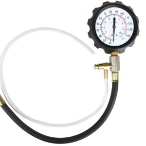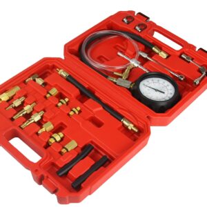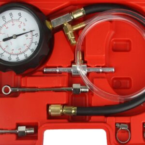 Zestaw zawiera adaptery i kształtki pasujące do większości układów wtrysku paliwa. Manometr z podwójną skalą: 0 – 140 psi oraz 0 – 10 bar.