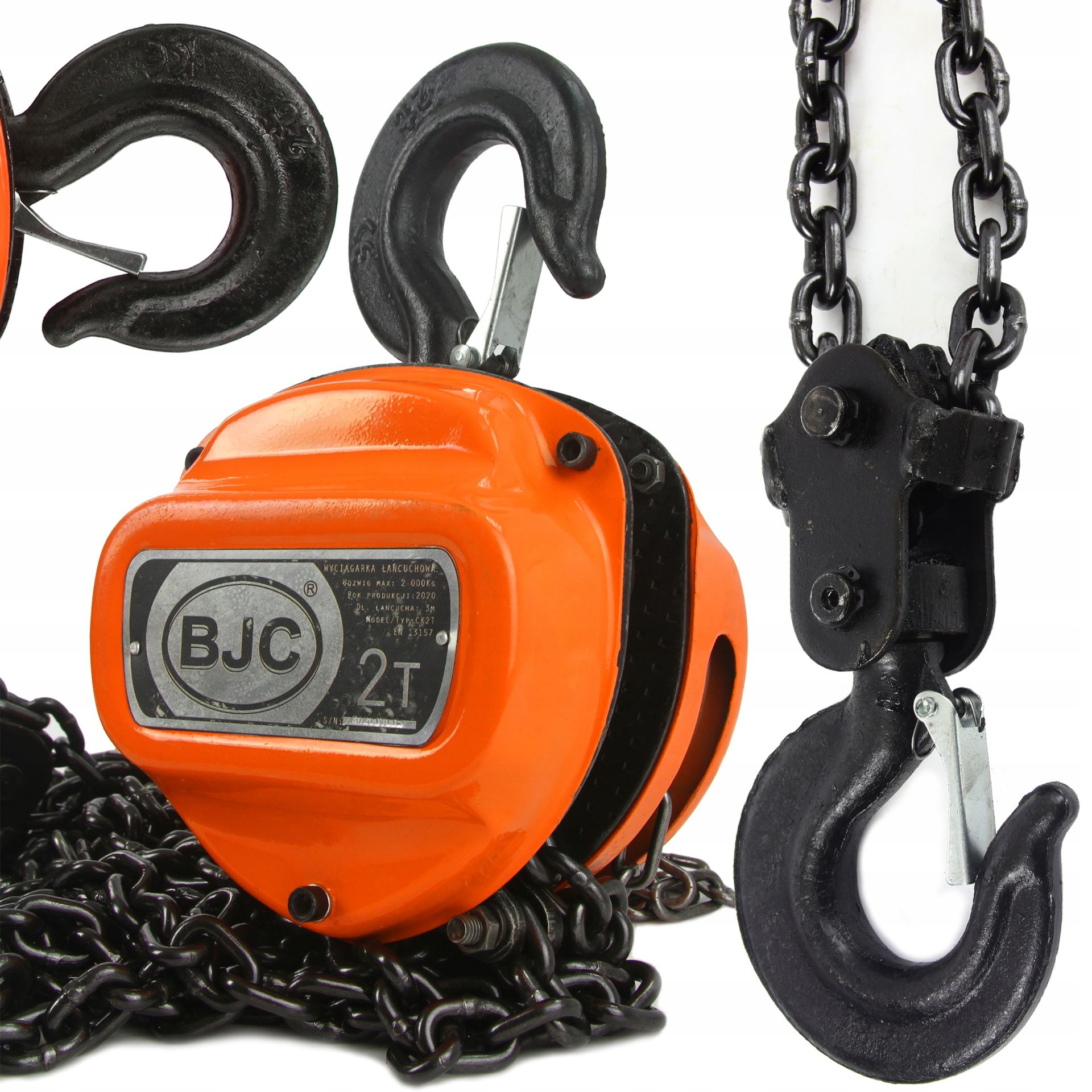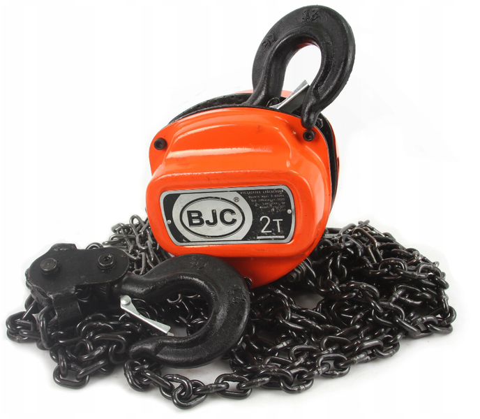 Wyciągarka łańcuchowa marki BJC posiada napęd ręczny i przekładnię, która pozwala na podniesienie ciężaru do 2000kg. Łańcuch wykonany z wysokiej jakości stali. Ogniwa łączone metodą zgrzewania oporowo-iskrowego, co gwarantuje odpowiednią jakość i wytrzymałość ogniwa. Wyciągarka wyposażona jest w bezpieczne haki posiadające blokadę uniemożliwiającą wypięcie się ładunku.