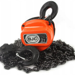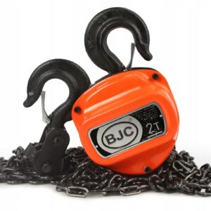 Wyciągarka łańcuchowa marki BJC posiada napęd ręczny i przekładnię, która pozwala na podniesienie ciężaru do 2000kg. Łańcuch wykonany z wysokiej jakości stali. Ogniwa łączone metodą zgrzewania oporowo-iskrowego, co gwarantuje odpowiednią jakość i wytrzymałość ogniwa. Wyciągarka wyposażona jest w bezpieczne haki posiadające blokadę uniemożliwiającą wypięcie się ładunku.