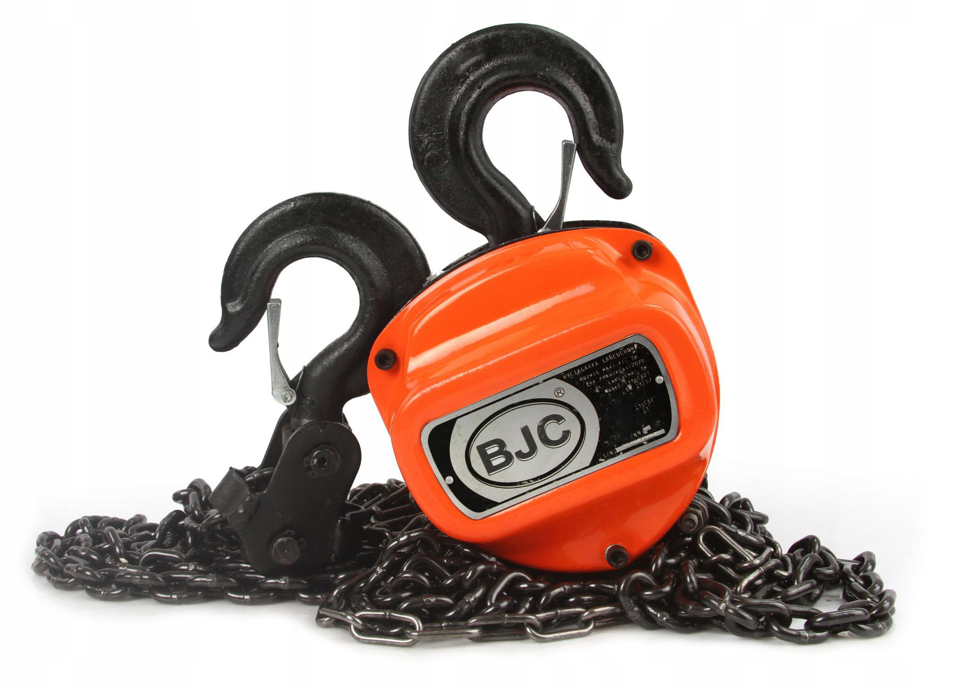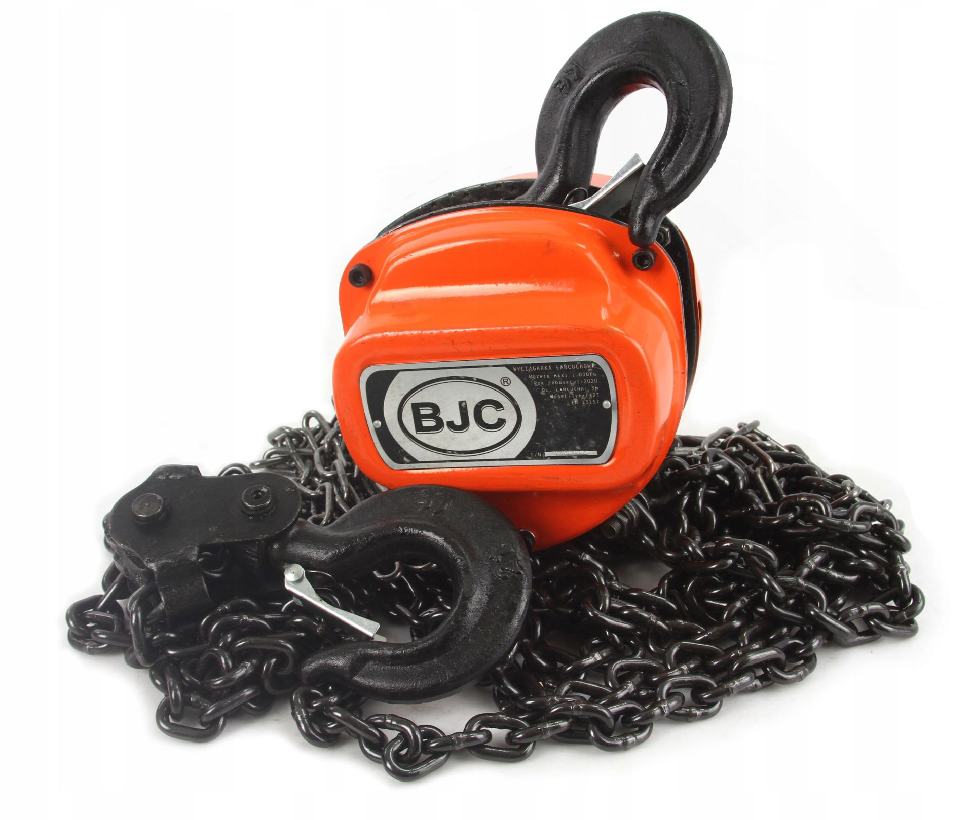 Wyciągarka łańcuchowa marki BJC posiada napęd ręczny i przekładnię, która pozwala na podniesienie ciężaru do 1000 kg. Łańcuch wykonany z wysokiej jakości stali. Ogniwa łączone metodą zgrzewania oporowo-iskrowego, co gwarantuje odpowiednią jakość i wytrzymałość ogniwa. Wyciągarka wyposażona jest w bezpieczne haki posiadające blokadę uniemożliwiającą wypięcie się ładunku.