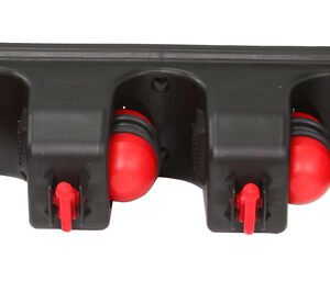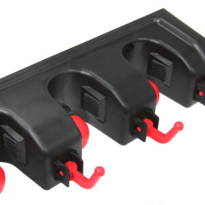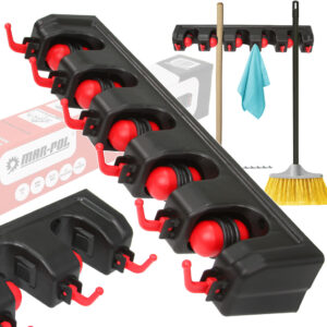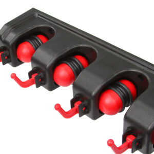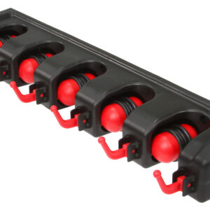 Niezwykle praktyczny garażowy wieszak ścienny na narzędzia ogrodowe. Wyposażony został w aż 5 automatycznych uchwytów, które same dopasowują się do grubości trzonka narzędzia (do maksymalnie 32 mm), dzięki samozaciskowej kulce oraz gumie ze stoperem.
