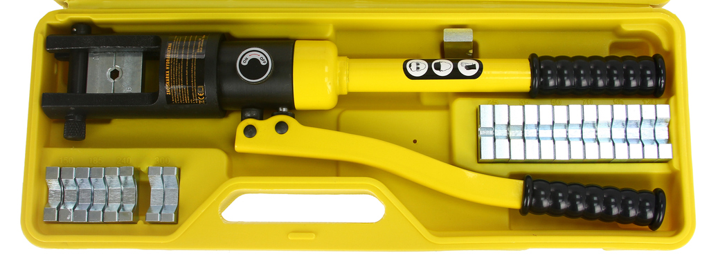 Praska ręczna z siłownikiem hydraulicznym. Przeznaczona do zaciskania końcówek na przewodach elektrycznych lub do zaciskania lin. Dzięki siłownikowi hydraulicznemu zaciskanie dużych końcówek nie wymaga wysiłku. Praska posiada obrotową głowicę. Długość zaciskarki 55 cm.