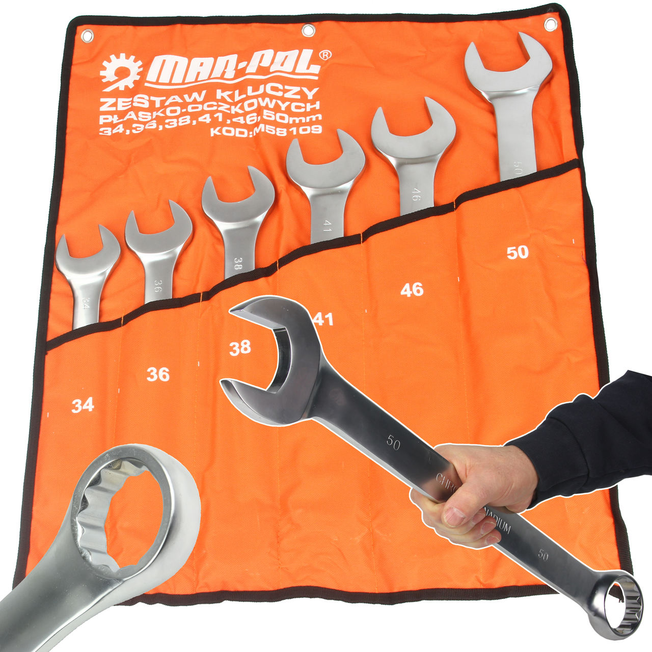 Rozmiary kluczy wchodzących w skład zestawu: 34,36, 38, 41, 46, 50 mm