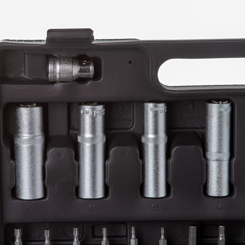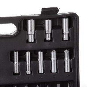 Wykonane z materiału chromowo-vanadowego (CrV – stal narzędziowa). Zestaw jest zapakowany w praktyczną walizkę. Nasadki odznaczają się dużą