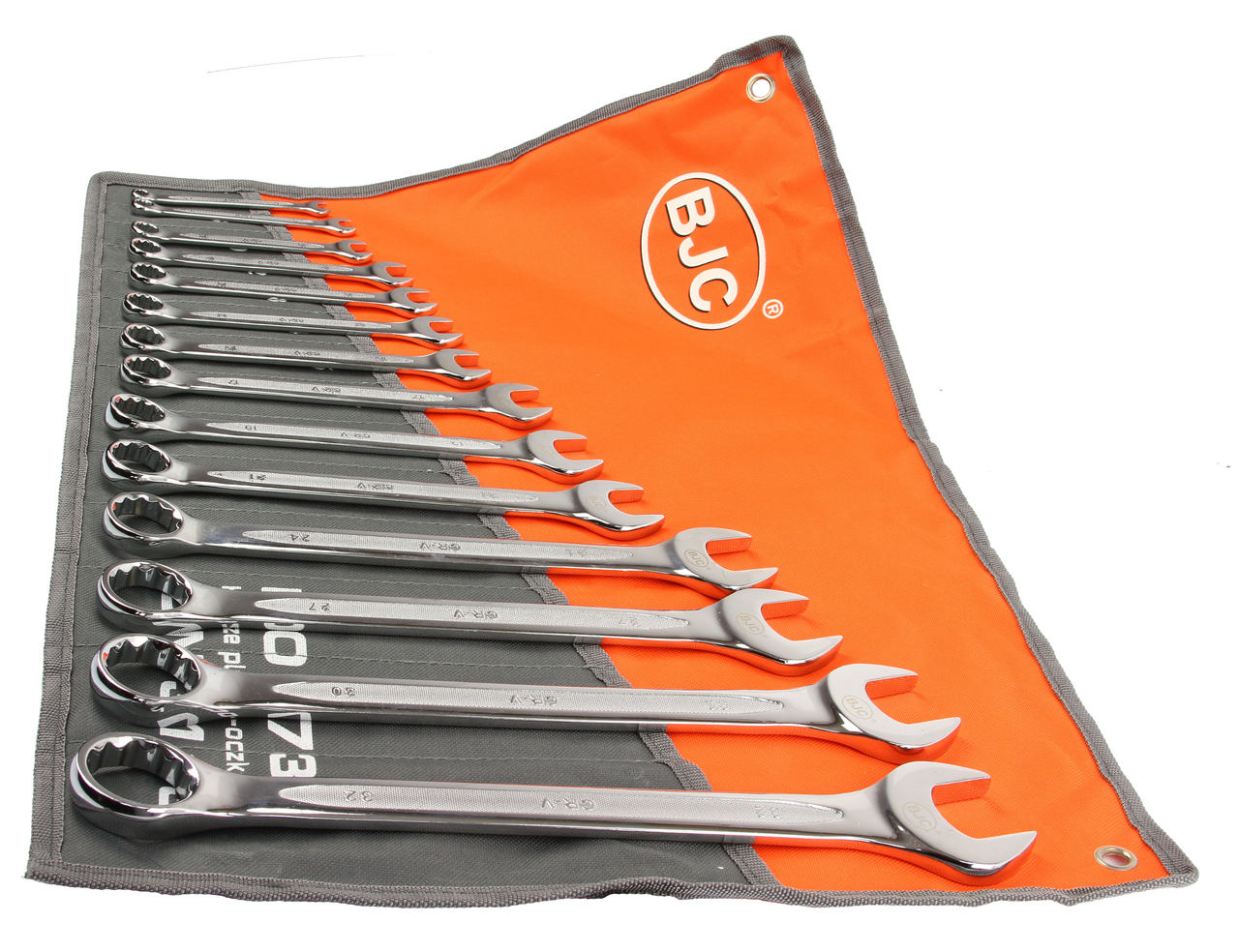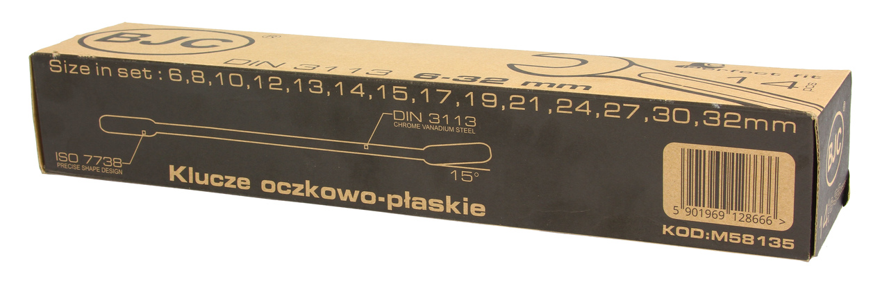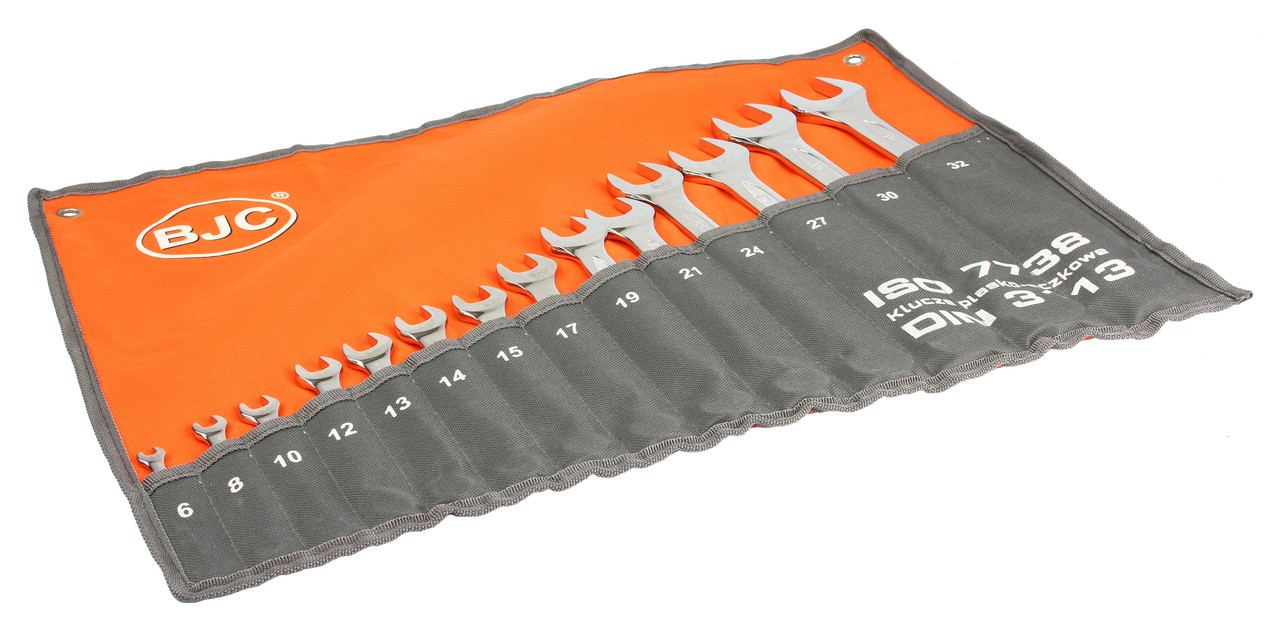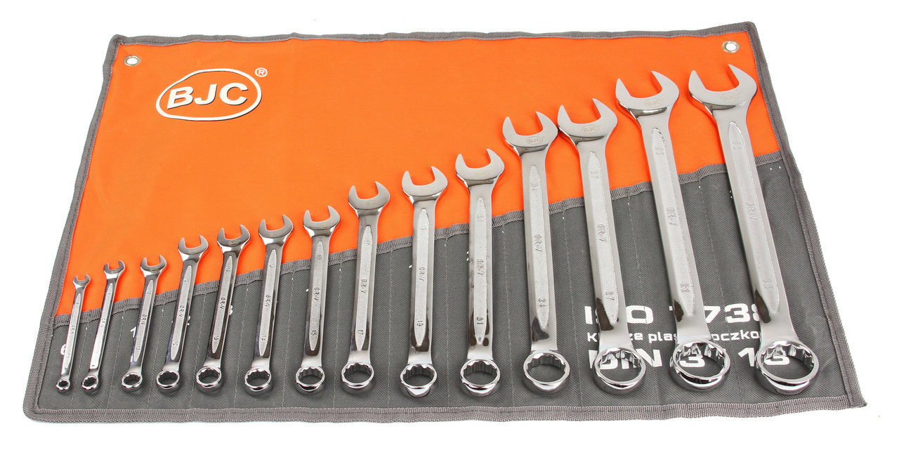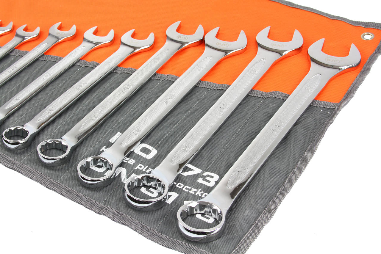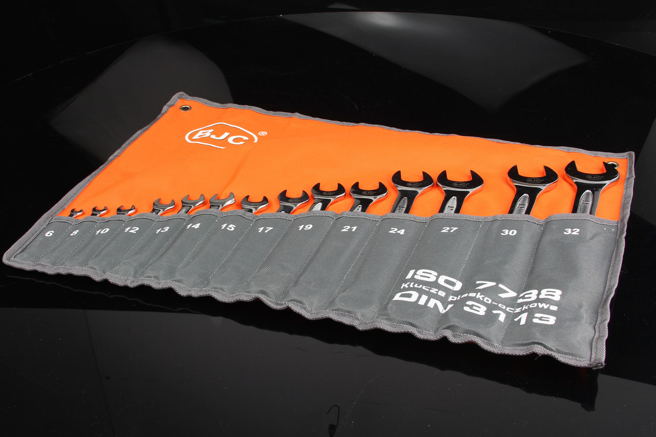 Zestaw kluczy płasko-oczkowych BJC zawiera klucze w popularnych rozmiarach, wykonane zgodnie z normą DIN 3113. Wysokogatunkowa stal chromowo-wanadowa zapewnia długoletnią wytrzymałość kluczy.