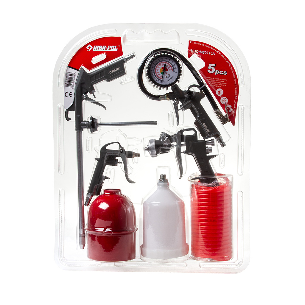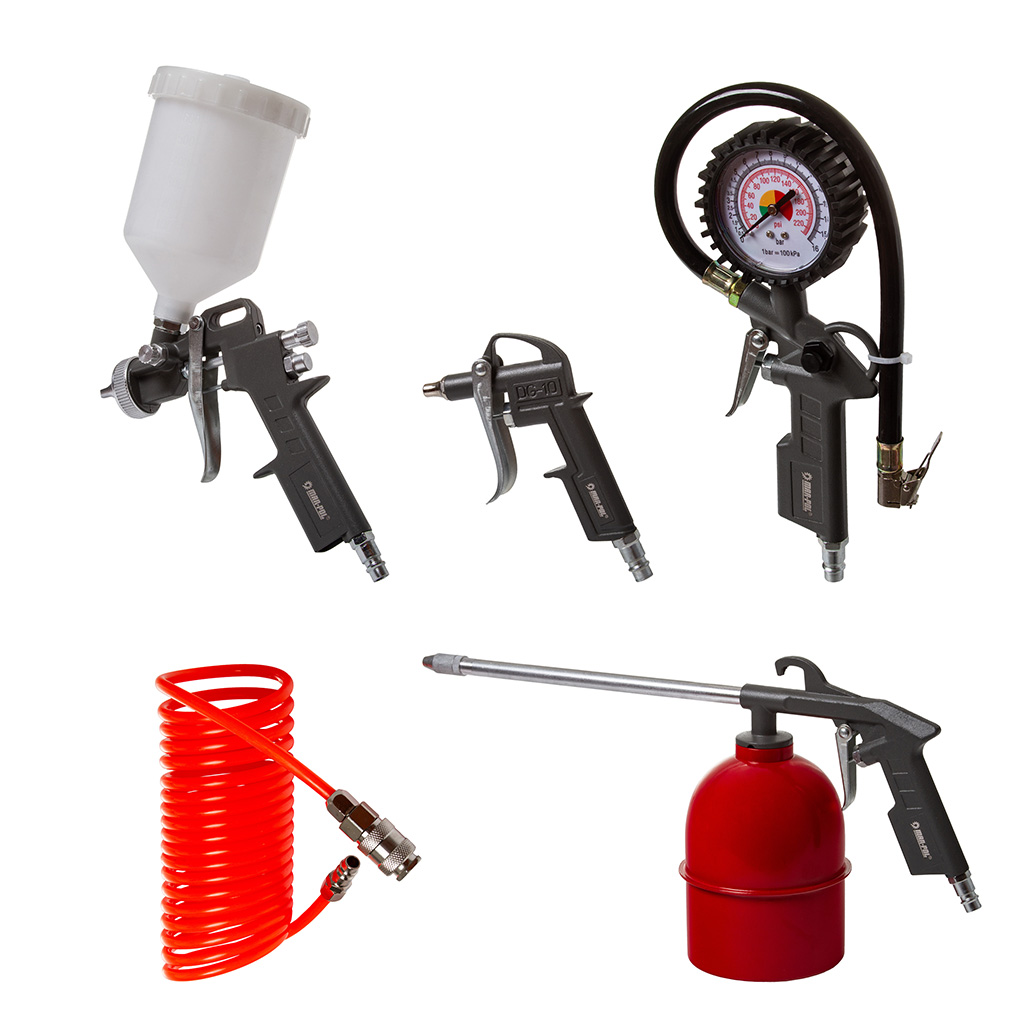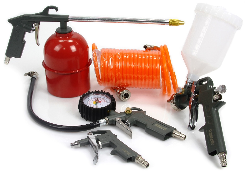 Zestaw pneumatycznych narzędzi lakierniczych do malowania, lakierowania, przedmuchiwania, ropowania i pompowania.