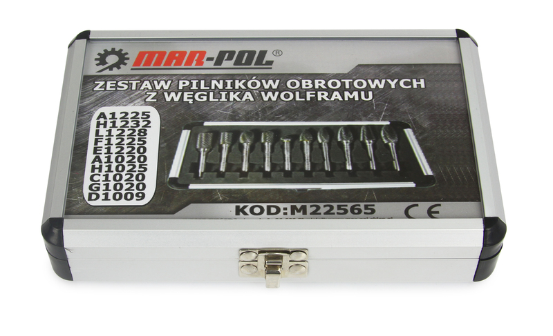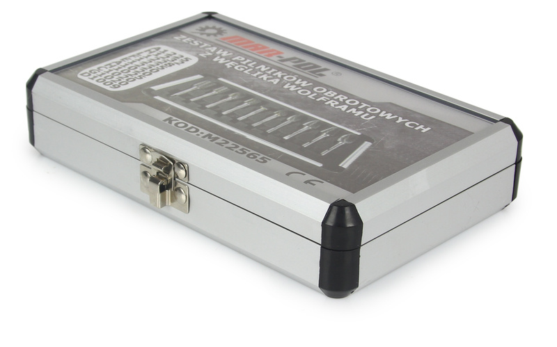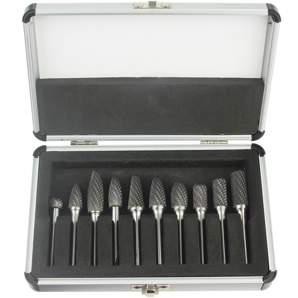 Zestaw 10 pilników rotacyjnych z węglika wolframu w praktycznym metalowym etui.