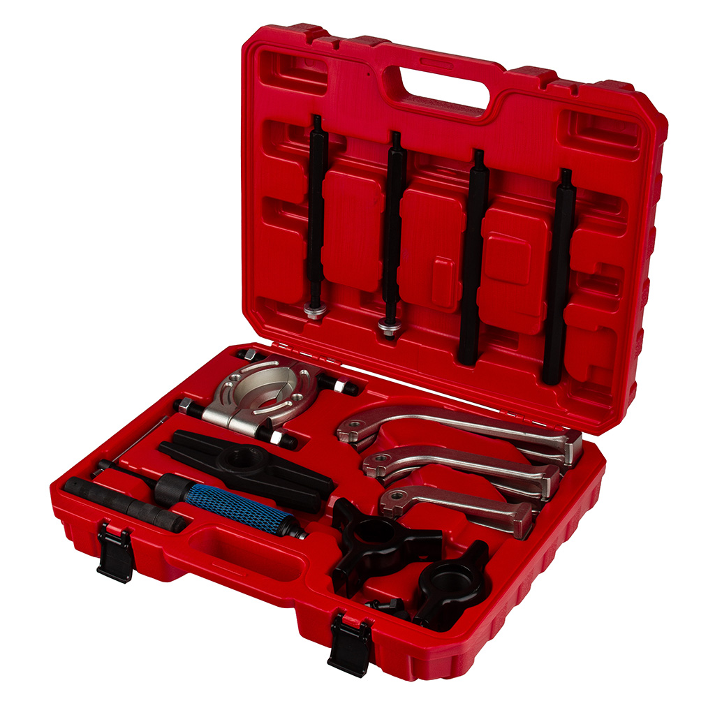 Uniwersalny ściągacz odpowiedni jest do wszelkiego rodzaju łożysk, tarczy, kół zębatych i wirników. Zestaw może działać jako ściągacz z 2 lub 3 szczękami dla długości 4, 6 lub 8” w szerokiej gamie rozmiarów. Znajdujący się w komplecie siłownik jest niezależny i nie wymaga zewnętrznej pompy. Niebezpieczeństwo poślizgu jest ograniczone do minimum dzięki solidnym, automatycznie zamykającym się ramionom ściągacza z precyzyjnie oszlifowanymi zaciskami.