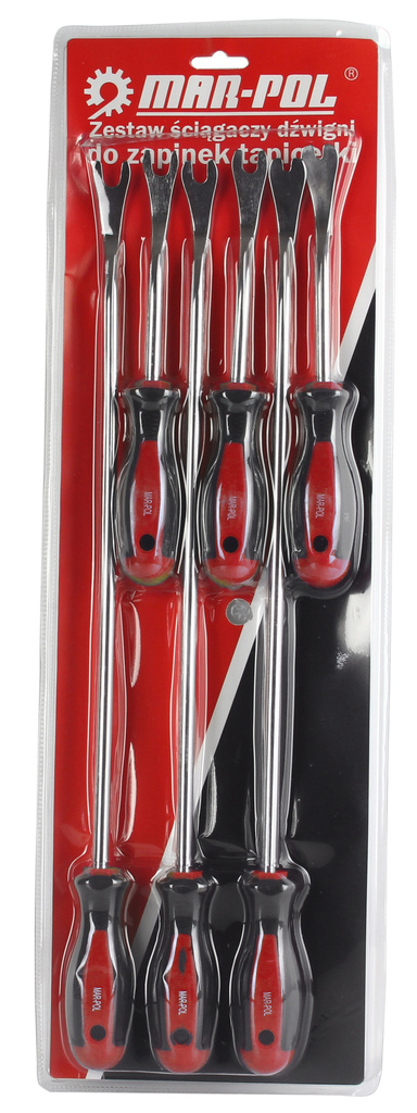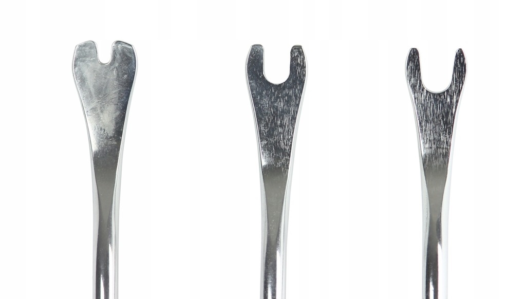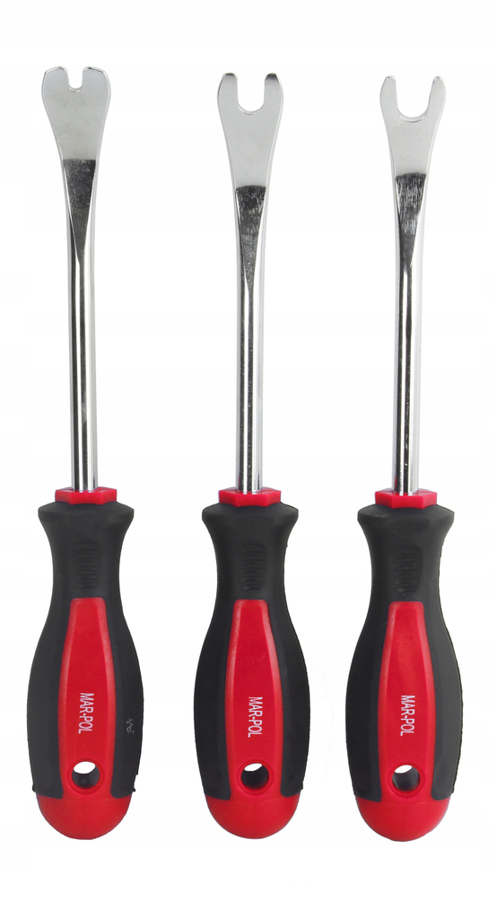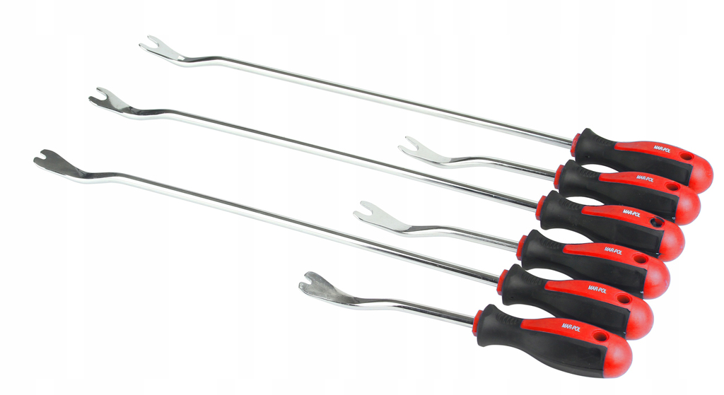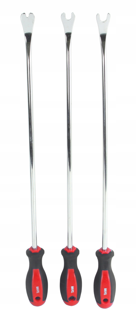 Dźwignie do zapinek tapicerskich ułatwiający demontaż kołków tapicerki, wewnętrznych poszyć oraz kołeczków zabezpieczających. Specjalny kształt końcówek zapobiega wszelkim uszkodzeniom. Chwytaki posiadają gumowe rękojeście.
