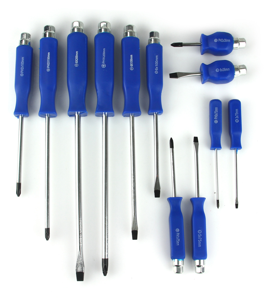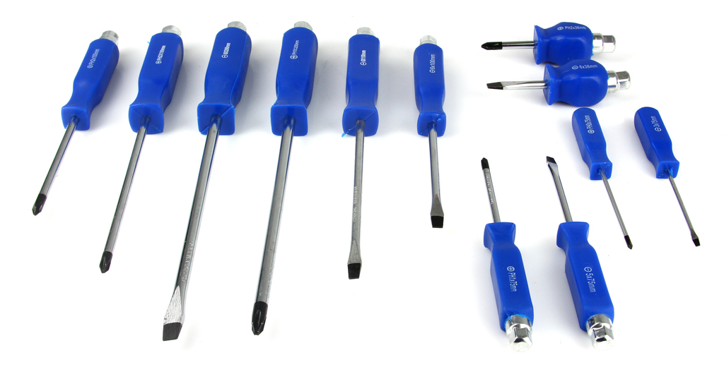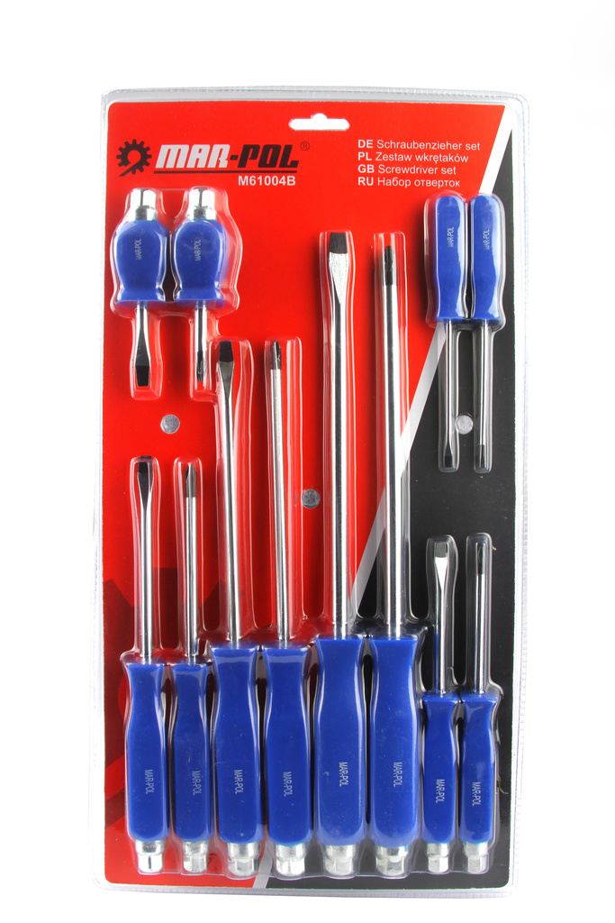 Zestaw wkrętaków ślusarskich 12 sztuk. Trzon przechodzący przez rękojeść, zakończony zabierakiem sześciokątnym do wspomagania kluczem.Przekrój rękojeści i trzonu sześciokątny. Końce magnetyczne. Materiał: CrV, końcówki dodatkowo utwardzane.